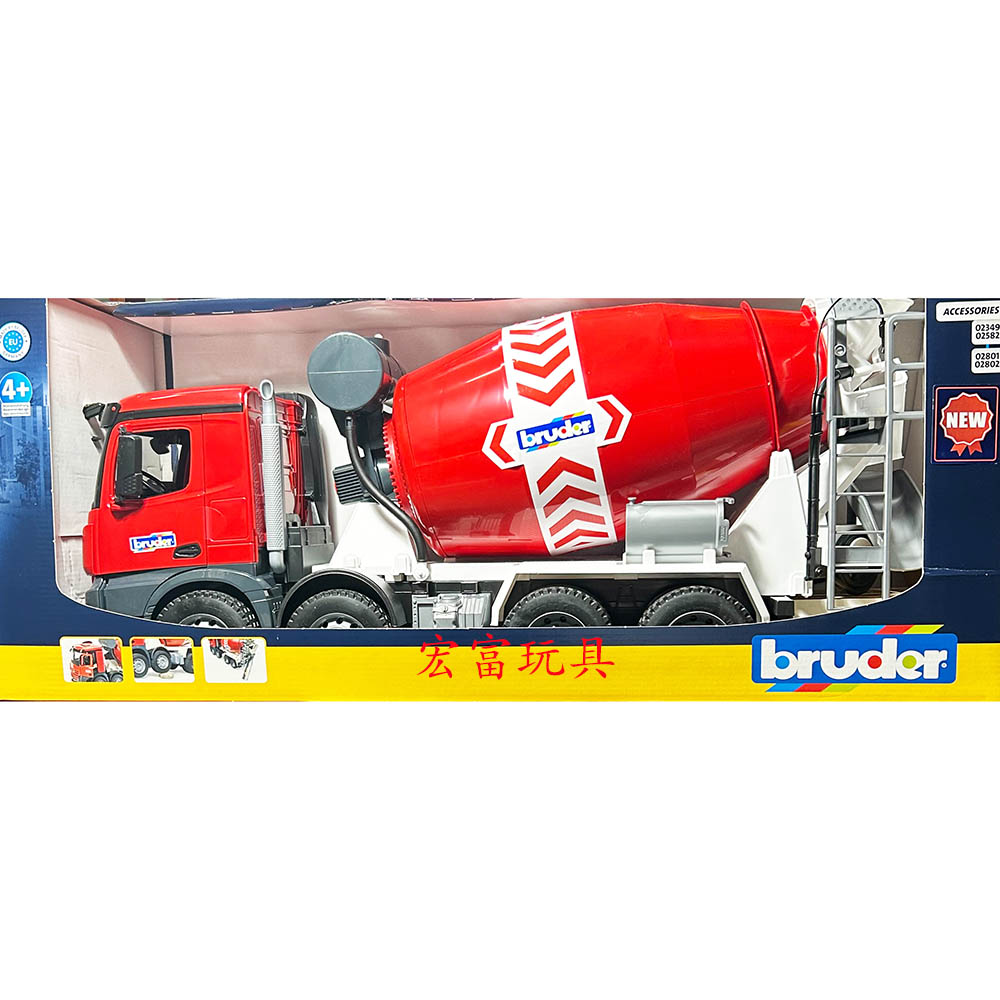 Puterea, durabilitatea si eficienta reprezinta adesea elemente cruciale in timpul unei zile de lucru pe santiere si drumuri. De aceea, Mercedes-Benz Arocs a fost special dezvoltat pentru a raspunde acestor necesitati. Designul a fost de asemenea revizuit pentru a se potrivi cu aceste caracteristici tehnice. De exemplu, partea frontala a grilei radiatorului este conceputa in look-ul tipic Arocs, reflectandu-i astfel puterea imensa. Cu acest model ne-am concentrat intensiv pe durabilitatea care caracterizeaza produsele BRUDER si am echipat cabina cu o usa ce se deschide pentru a oferi acces figurinelor BRUDER in vehicul. Tamburul betonierei camion poate fi rotit prin intermediul unei manivele amplasate in rezervorul de apa ce se desfasoara (tambur cu spirala transportoare si mixer). Exact ca si originalul, tamburul este golit inversand directia de rotatie. Spirala din interiorul tamburului livreaza incarcatura la gura de descarcare din spate.