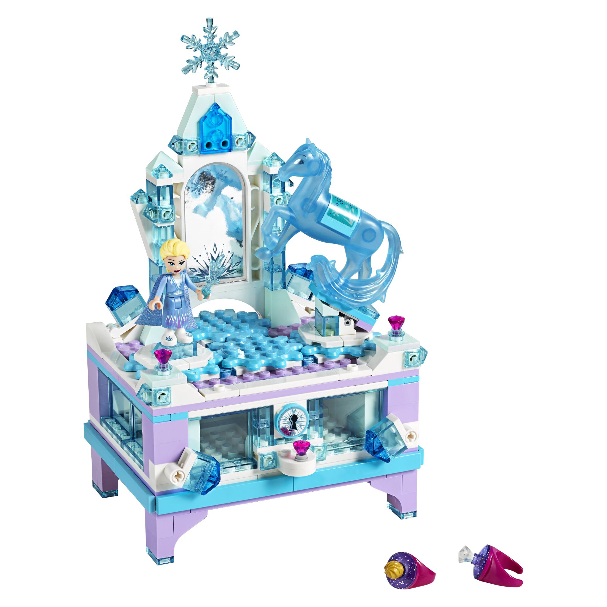Construieste-ti propria ta cutie frumoasa de bijuterii Regatul de gheata II inspirata de castelul de gheata al Elsei si tine-ti toate comorile inauntru! Roteste pentru a-i vedea pe Elsa si Nokk, rotindu-se in jurul oglinzii. Atinge zavorul special pentru a deschide sertarul si pune bijuteriile preferate inauntru - plus 2 noi inele LEGO pentru a le adauga colectiei!