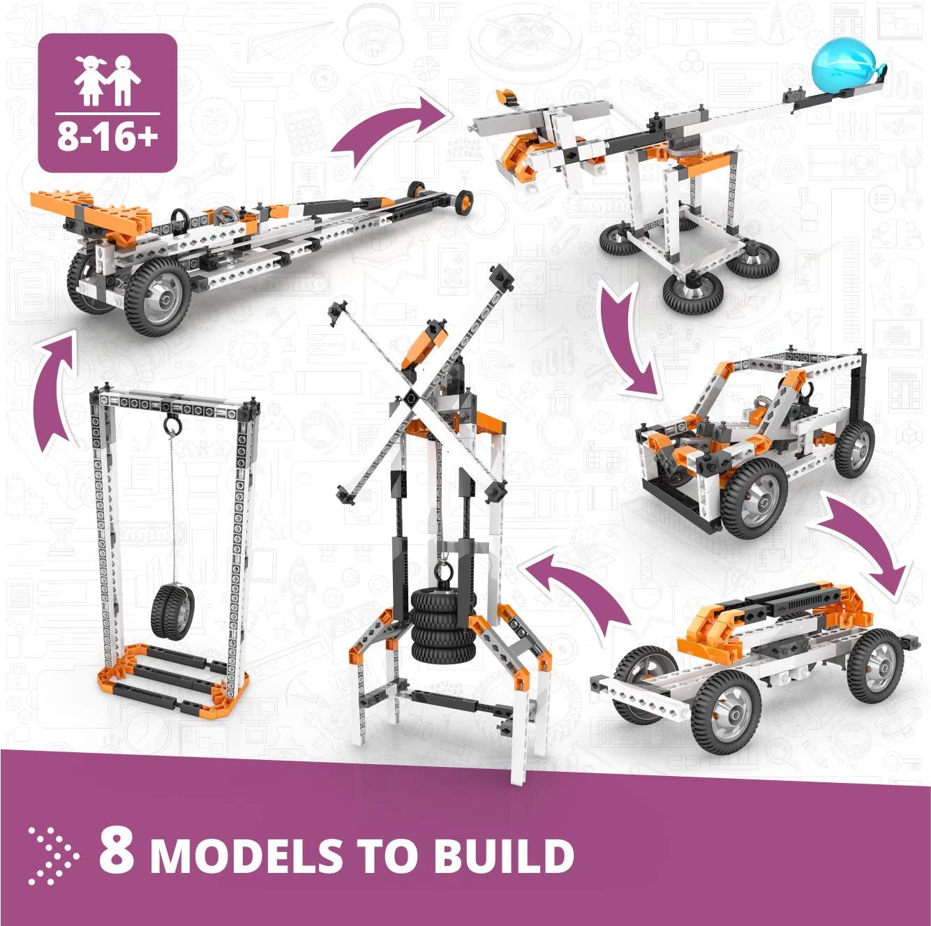 Cu Descoperirea STEM - Legile lui Newton, aflați totul despre ingenioasele legi ale mișcării lui Sir Isaac Newton, care stau la baza mecanicii clasice care încă mai descriu majoritatea situațiilor din viața de zi cu zi. Observați efectele energiei cinetice și potențiale, și observați în primul rând modul în care energia este transformată de la o formă la alta. Construiți 8 modele de lucru, cum ar fi o catapultă balistică, un ventilator gravitațional, o mașină de coliziune, o cabină în mișcare, un avion cu balon și un dragster. Puteți găsi instrucțiuni de construcție ușor de urmărit pentru toate modelele, fie online, fie în broșura inclusă. Broșura oferă explicații detaliate ale diferitelor principii științifice aplicate și include activități experimentale inovatoare pentru învățarea practică. O secțiune de testare este de asemenea disponibilă pentru a vă contesta cunoștințele recent dobândite! efectuează experimente minuțioase și descoperă - prima lege a mișcării și relația dintre forță și mișcare - a doua lege a mișcării și relația dintre forță, masă și accelerație - a treia lege a mișcării și fizica forței de reacție a lui Newton - conceptul de impuls - proprietățile fundamentale ale energiei - ce factori afectează energiile potențiale și cinetice.