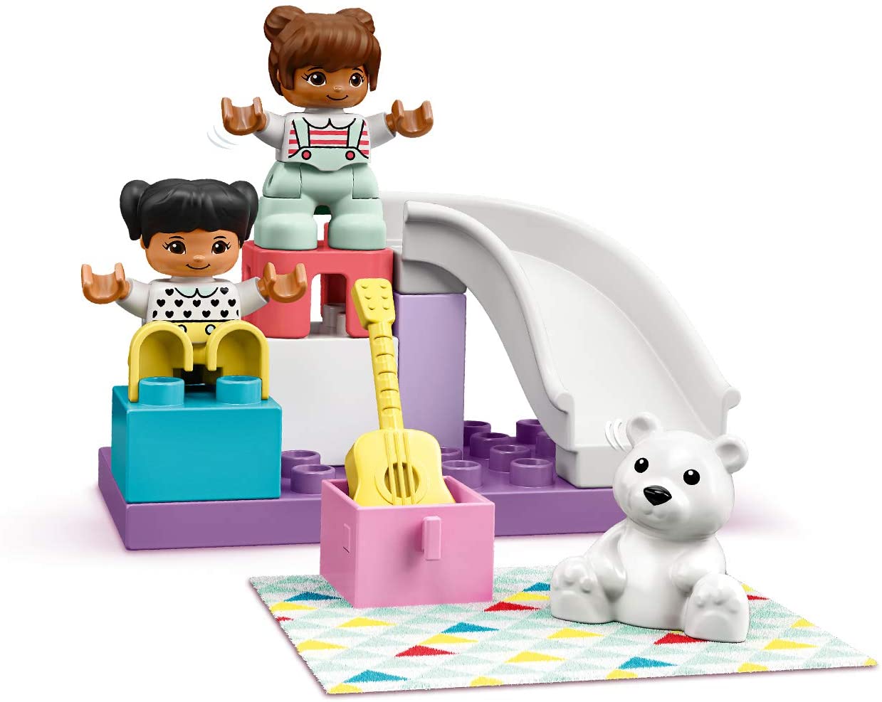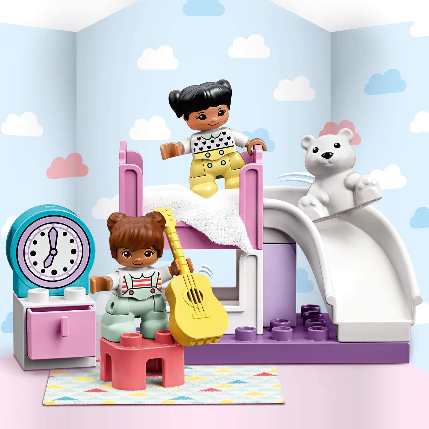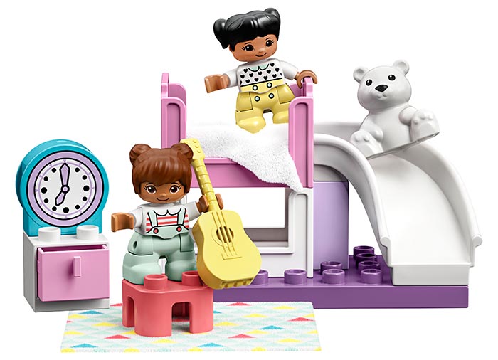 Dormitoarele nu sunt doar pentru dormit, nu? Cu acest set de joc plin de distractie, activitatile nu se opresc niciodata! Alatura-te celor 2 figurine fete pentru a petrece noaptea in patul lor supraetajat. Ai un ursulet mare de dezmierdat, o chitara pentru a canta, iar patul de sus are propriul sau tobogan! Cand ceasul arata ca a sosit timpul pentru somn, du fetele la culcare, apoi - e timpul sa te trezesti! - distractia cu joaca pe roluri continua si dimineata.