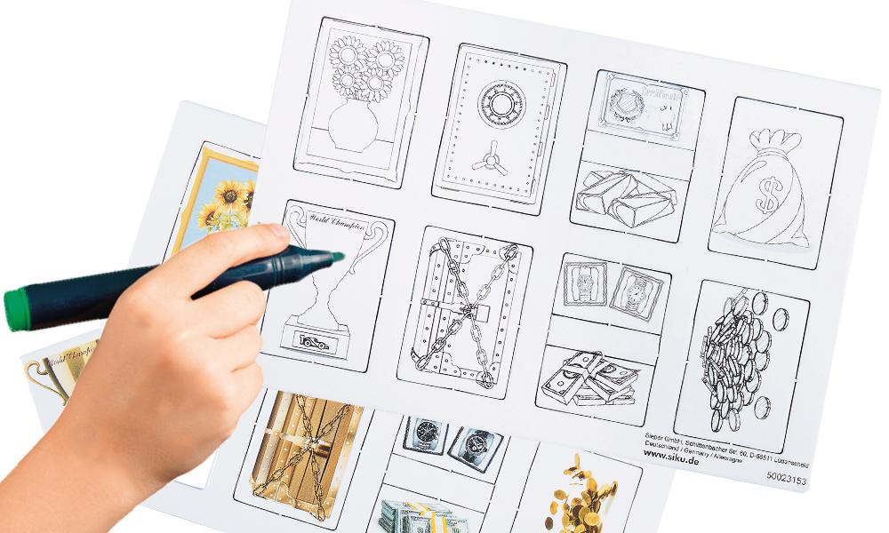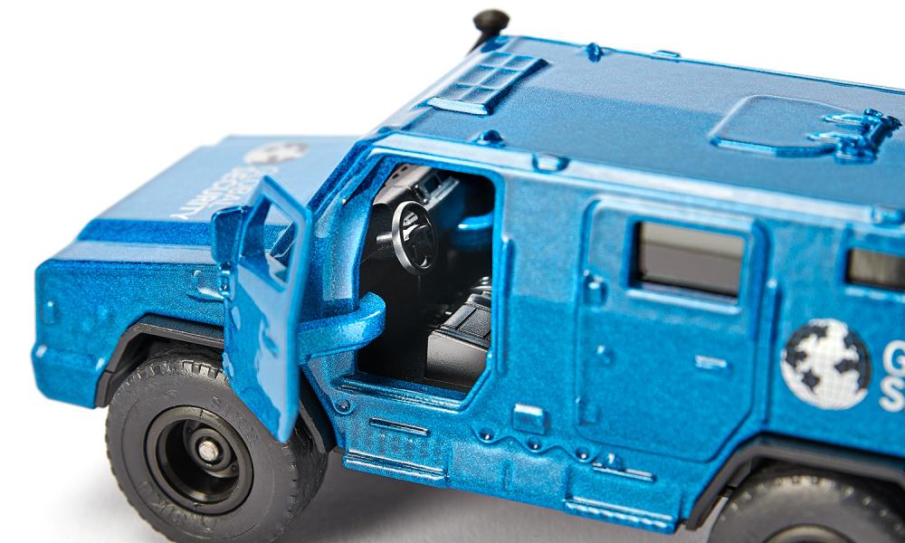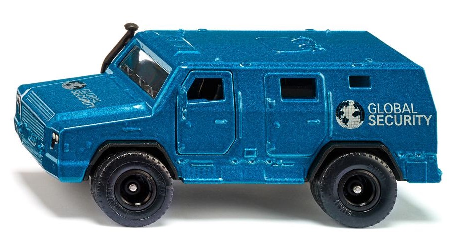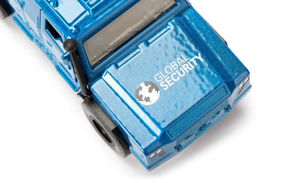 Duba din oțel blindat la scara 1:50 cu un șasiu puternic 4x4 LKW și cea mai recentă tehnologie de protecție – Rheinmetall Survivor. Este destinată misiunilor speciale importante și pentru transportul de încărcături valoroase sau sensibile. Fie că sunt bancnote, bijuterii, opere de artă importante sau documente controversate – în compartimentul blindat din oțel, încărcătura este protejată 100%. Duba pentru transport de bani de la Siku are culoarea albastru metalic discret, iar pe laterale este aplicată sigla „Global Security”. Ușile laterale și din spate pot fi deschise. Vehiculul poate fi personalizat și mai mult cu autocolante: de exemplu cu „Transport de bani și valori” și „Monitorizat prin GPS” în diferite limbi. Pentru un plus de realism, setul include și patru lingouri mici de aur și alte elemente din carton. Acestea sunt ilustrate cu saci cu bani, casete cu numerar, tablouri și certificate. O coală de carton este deja colorată, iar cealaltă include doar contururile, astfel încât elementele pot fi colorate după bunul plac al utilizatorului.