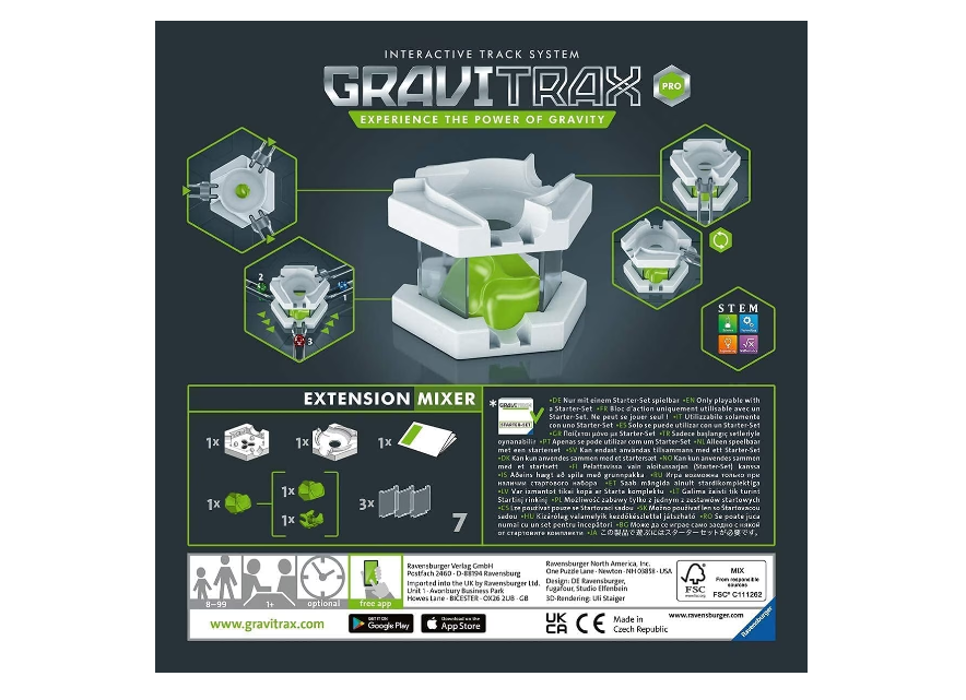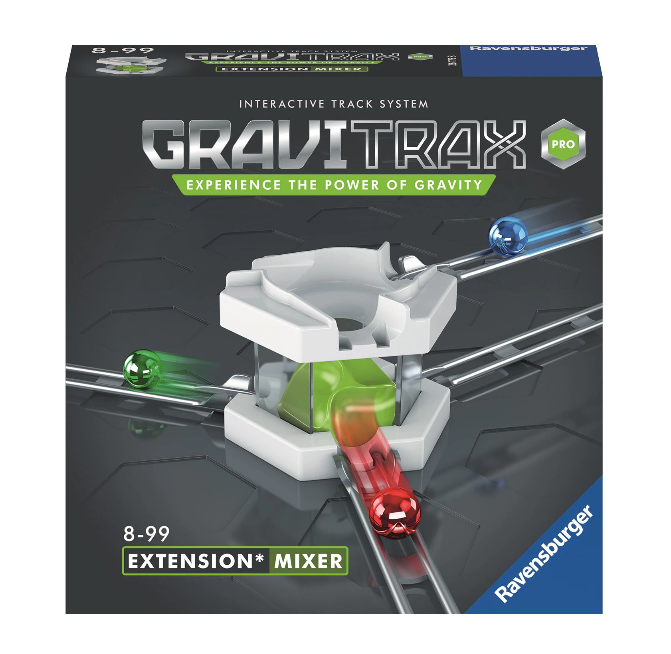 Amesteca calatoria bilelor cu"GraviTrax PRO Mixer". Adaugati o surpriza pieselor dvs. trimitand pana la trei bile in Mixer si vedeti din ce parti ies. Combinati acest accesoriu cu setul de pornire GraviTrax Pro. Acest set include 1x Mixer Base.