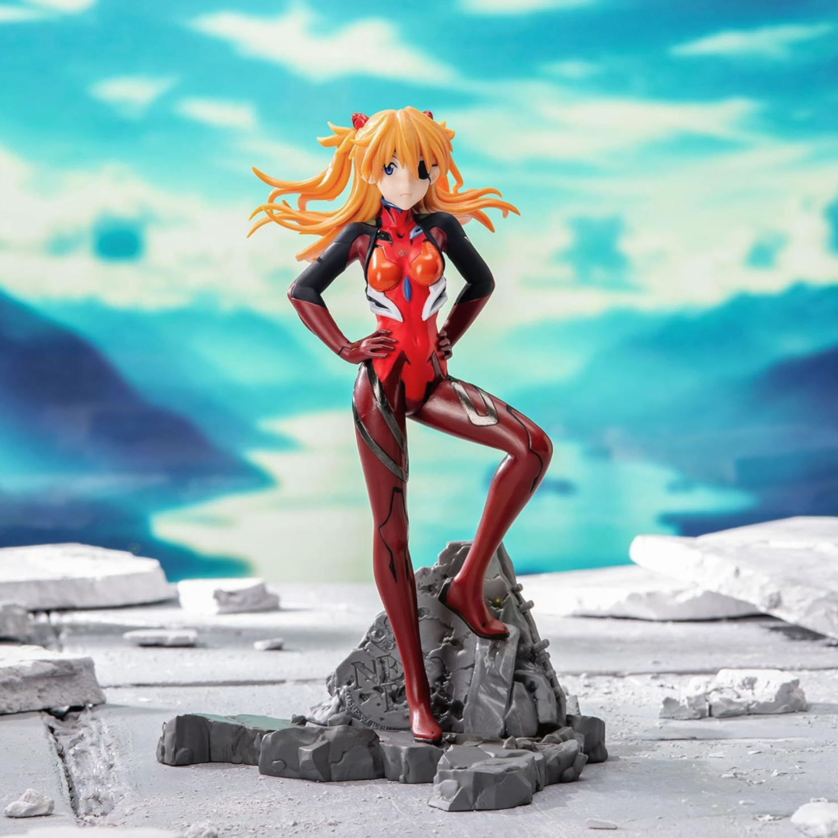 - Design iconic: Asuka în plugsuit roșu, cu păr în vânt și expresie hotărâtă – pe o bază stâncoasă potrivită arcului final