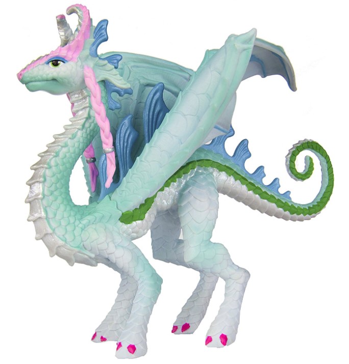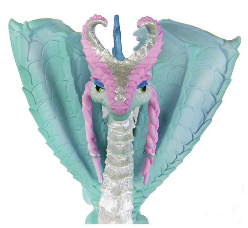 Figurină Dragonul Prințesă în culori pastelate, cu diferite nuanțe de verde și albastru și accente de roz.