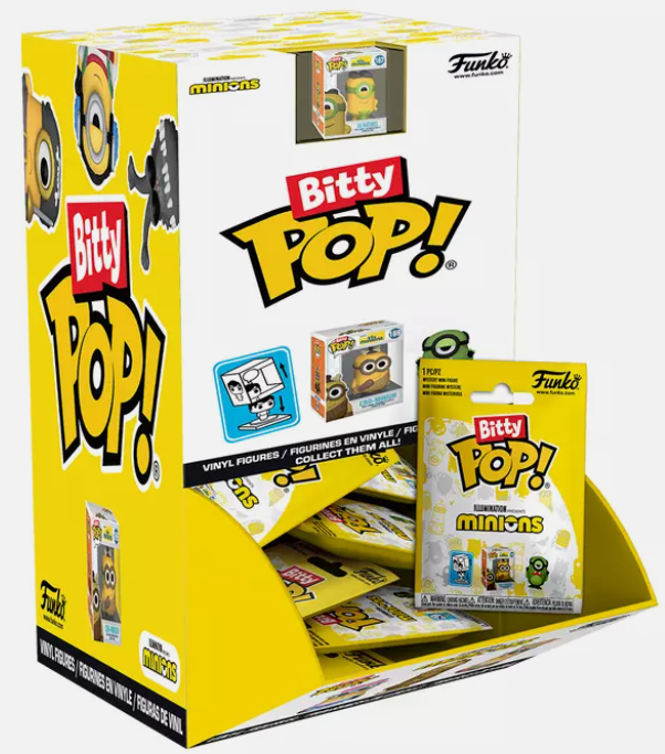 Există Bitty Pop! Ochi, Matie, Bitty Pop! Cro-Minion, Bitty Pop! Au Naturel, Bitty Pop! Frankenbob, Bitty Pop! Mireasă Kevin, Bitty Pop! Creatura Mel, Bitty Pop! Patinaj cu rotile Stuart, Bitty Pop! Pijama Bob, Bitty Pop! Kung Fu Kevin (aur), Bitty Pop! Turistul Dave, Bitty Pop! Turistul Jerry și Bitty Pop! Kyle.