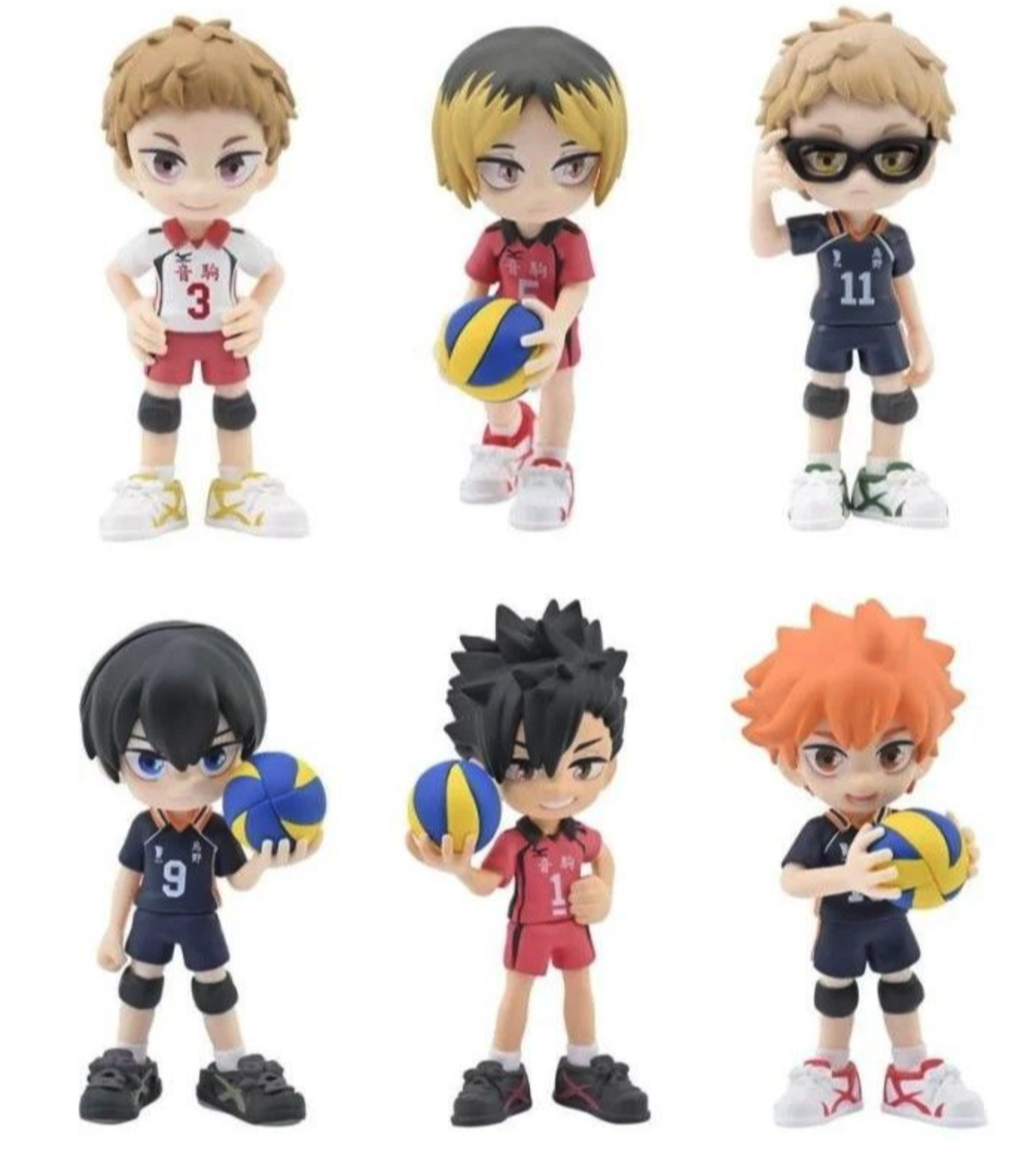 - Design detaliat și stilizat: Fiecare mini-figură redă cu fidelitate trăsăturile distinctive ale personajelor din Haikyu!!, precum Shoyo Hinata, Tobio Kageyama, Kei Tsukishima, Tetsuro Kuroo, Kenma Kozume și Morisuke Yaku.