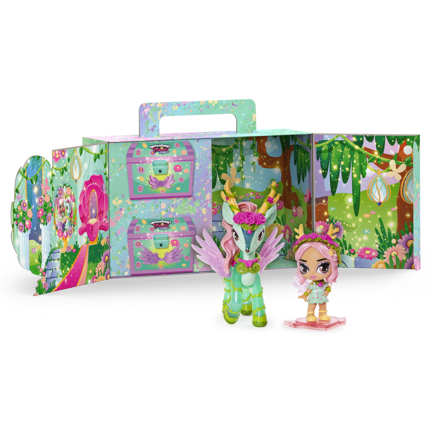 Va prezentam familia Pixie si Hatchimals cu NOUA conexiune mistica! Calaretii Pixie au picioare mobile si se deplaseaza cu adevarat pe navele lor! Cutia devine un Castel magic. Setul include 1 pilot Pixie, 1 transportator, 4 accesorii, 1 cutie castel, 1 fisa de colectionar.