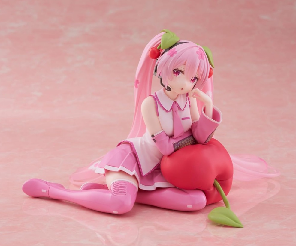 Adaugă un strop de primăvară în colecția ta cu adorabila figură Sakura Miku, parte din seria Desktop Cute de la TAITO. Ea stă lejer în șezut, sprijinindu-se de un pernă-roșie în formă de cireașă, într-o postură „perching” ce cucerește rapid privirile.