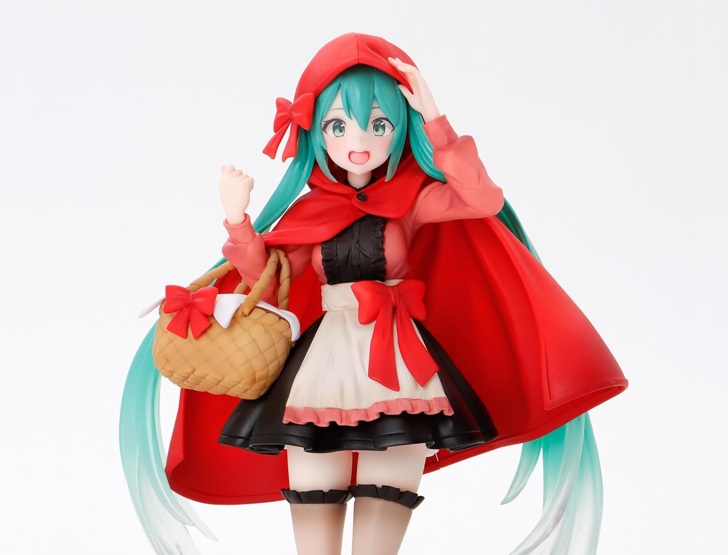 • Design inedit – Miku poartă capa roșie iconică, rochie alb-negru și ține un coș cu detalii fine; părul lung verde-azuriu în tonuri translucid la vârfuri pentru efect vizual .