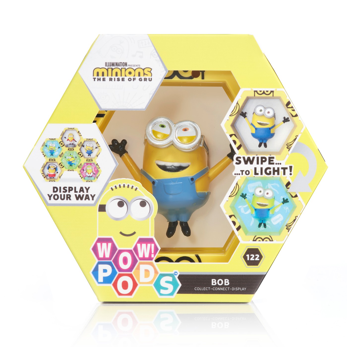 Fiecare personaj este situat in propriul POD in forma de hexagon cu lumini UV si senzor IR incorporat. Pur si simplu miscati mana peste senzor pentru a lumina WOW-ul! POD-ul! Misca-ti mana in fata POD-ului pentru a-l lumina si a dezvalui pictograme ascunse in spatele WOW!Pod-ului! Lumina se stinge automat dupa 30 de secunde. Conectati-le in cateva secunde! Colectia ta poate lua diferite forme si avea in fiecare zi, alt look! Limita e doar de imaginatia ta! Puteti chiar sa va scrieti numele sau initialele pentru a crea un afisaj care este fara indoiala si unic al dvs.! Colectionati si conectati personajele favorite printr-o colectie mai vasta de eroi WOW! PODS! Sunt disponibile personaje : Marvel, DC, Disney, Disney Frozen, Sonic, Jurassic World, Harry Potter, Minionii si altele. Acest pachet contine personajul Bob.