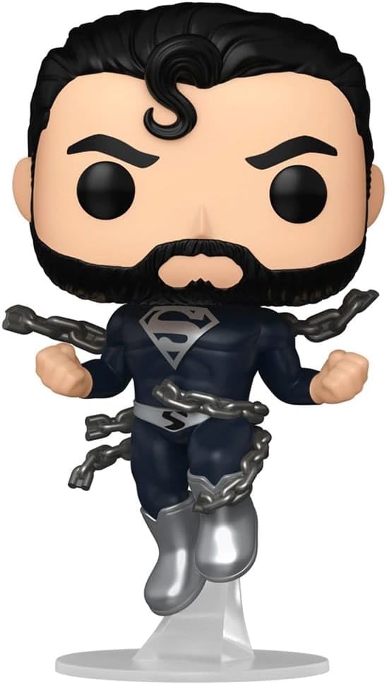 Superman într-un costum negru, rupând lanțuri, ca în seria de benzi desenate Superman Losi & Clark