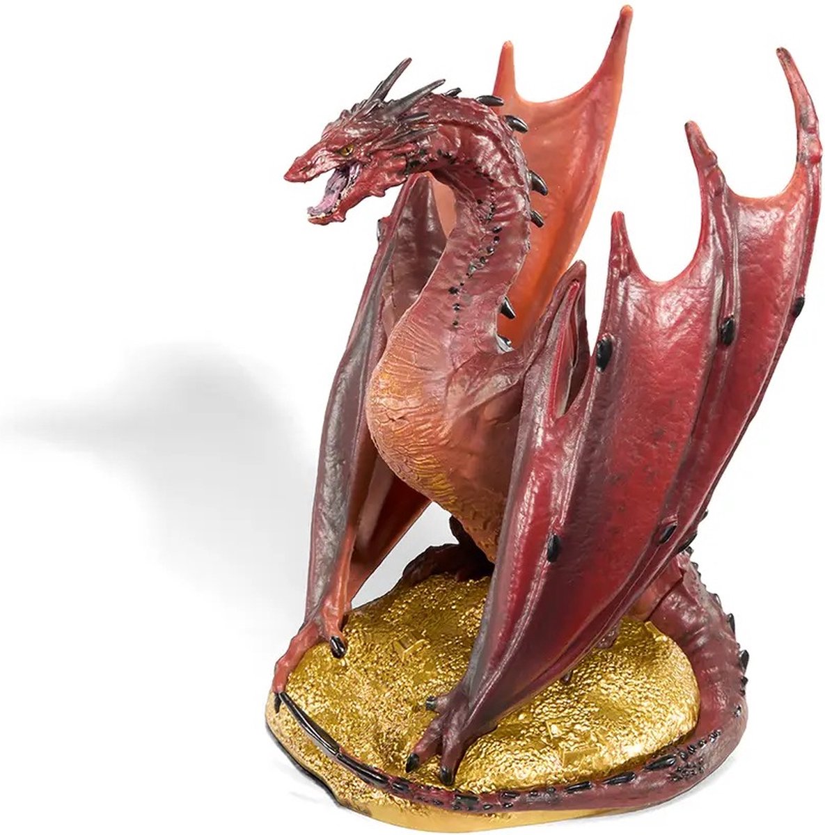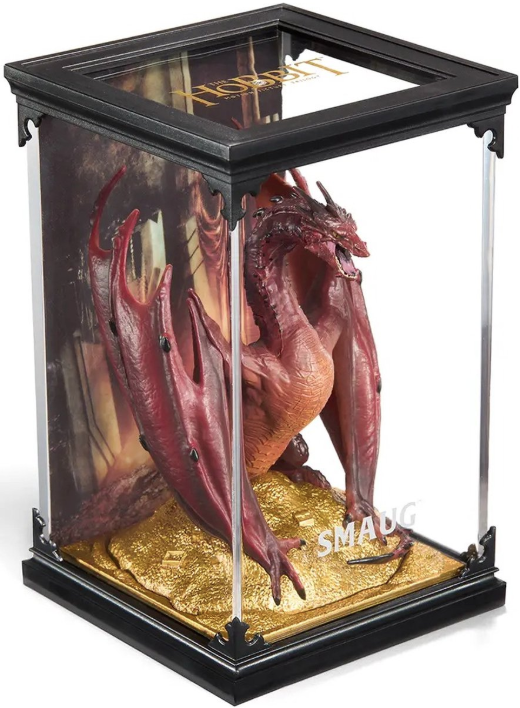 Această figurina din trei părți include un capac cu fundal, o bază și o figură detașabilă a dragonului Smaug.
