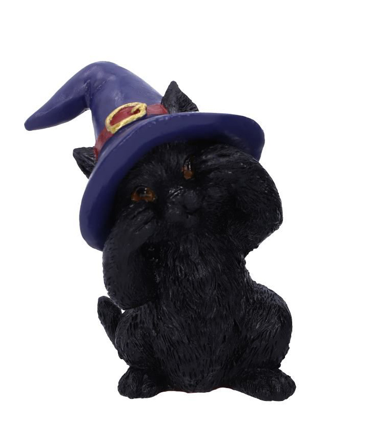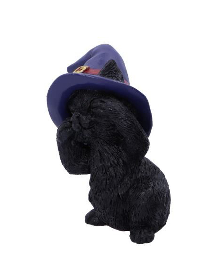 O pisică fermecătoare cu pălărie de vrăjitoare, ilustrând conceptul "Nu văd, nu aud, nu vorbesc". Figurina este fabricată din rășină de înaltă calitate și este pictată manual.