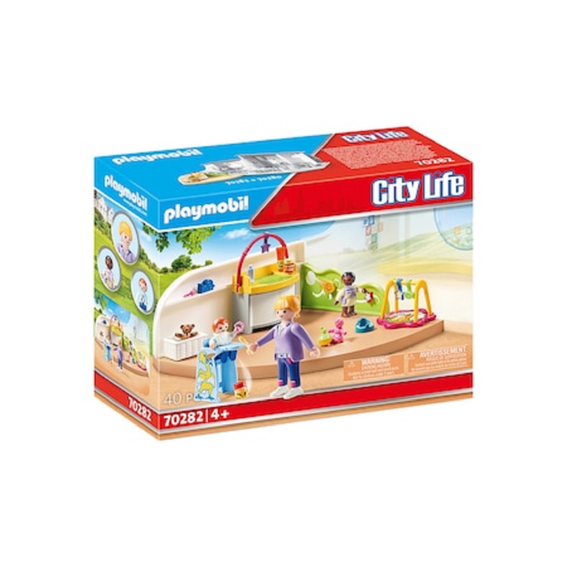 Camera copilasior de la Playmobil este ideala pentru a avea grija de cei mici si pentru a-i distra toata ziua. Ingrijitorul are grija de un bebelus pe masa de schimb. Micutul da din picioare vesel si se uita la zornaitoarea colorata. Intre timp, celalalt bebelus se amuza de jucariile de deasupra lui si dupa putin timp chicoteste. Timpul trece atat de repede in camera copilasilor!