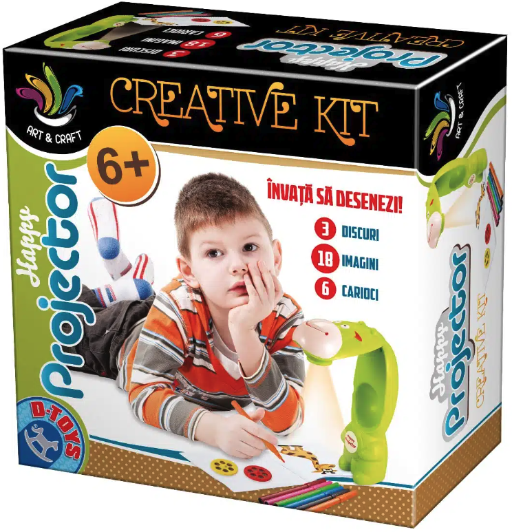 Învață să desenezi cu ajutorul acestui proiector superb în formă de hipopotam! Ai la dispoziție 3 discuri cu 18 imagini drăguțe precum și 6 carioci colorate.