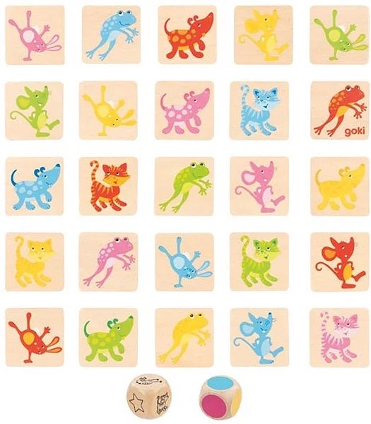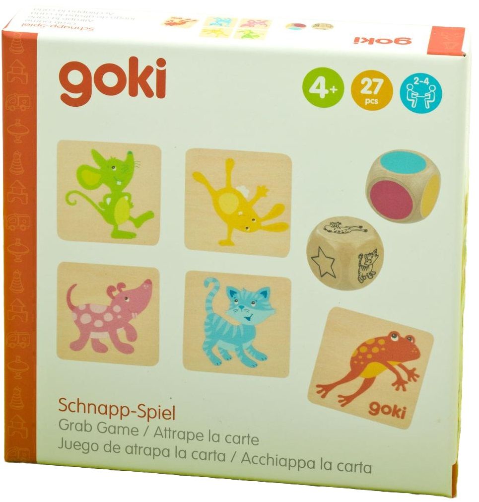 Se întâmplă multe în jocul Goki Grab! Accentul este pus pe cele 5 animale amuzante: câine, pisică, șoarece, broască și iepure, fiecare dintre ele fiind disponibil în 5 variante de culoare. Aceste 25 de plăci din lemn cu motive de animale sunt așezate în mijlocul mesei în ordine aleatorie. Acum zarurile sunt aruncate. Unul dintre zaruri arată simbolurile animalelor, celălalt arată culorile. Zarurile au fost aruncate și acum este vorba de a prinde animalul potrivit la fel de repede ca fulgerul. Sună ușor, dar este mult, mult mai dificil decât se aștepta. Culorile și formele animalelor sunt concepute pentru a provoca multă confuzie. Pe scurt: un joc rapid, cu un factor de distracție grozav și multă acțiune.