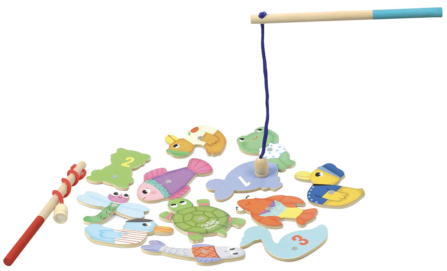 Setul conține două tije magnetice de pescuit și douăsprezece piese magnetice din lemn cu diferite forme și animale imprimate.