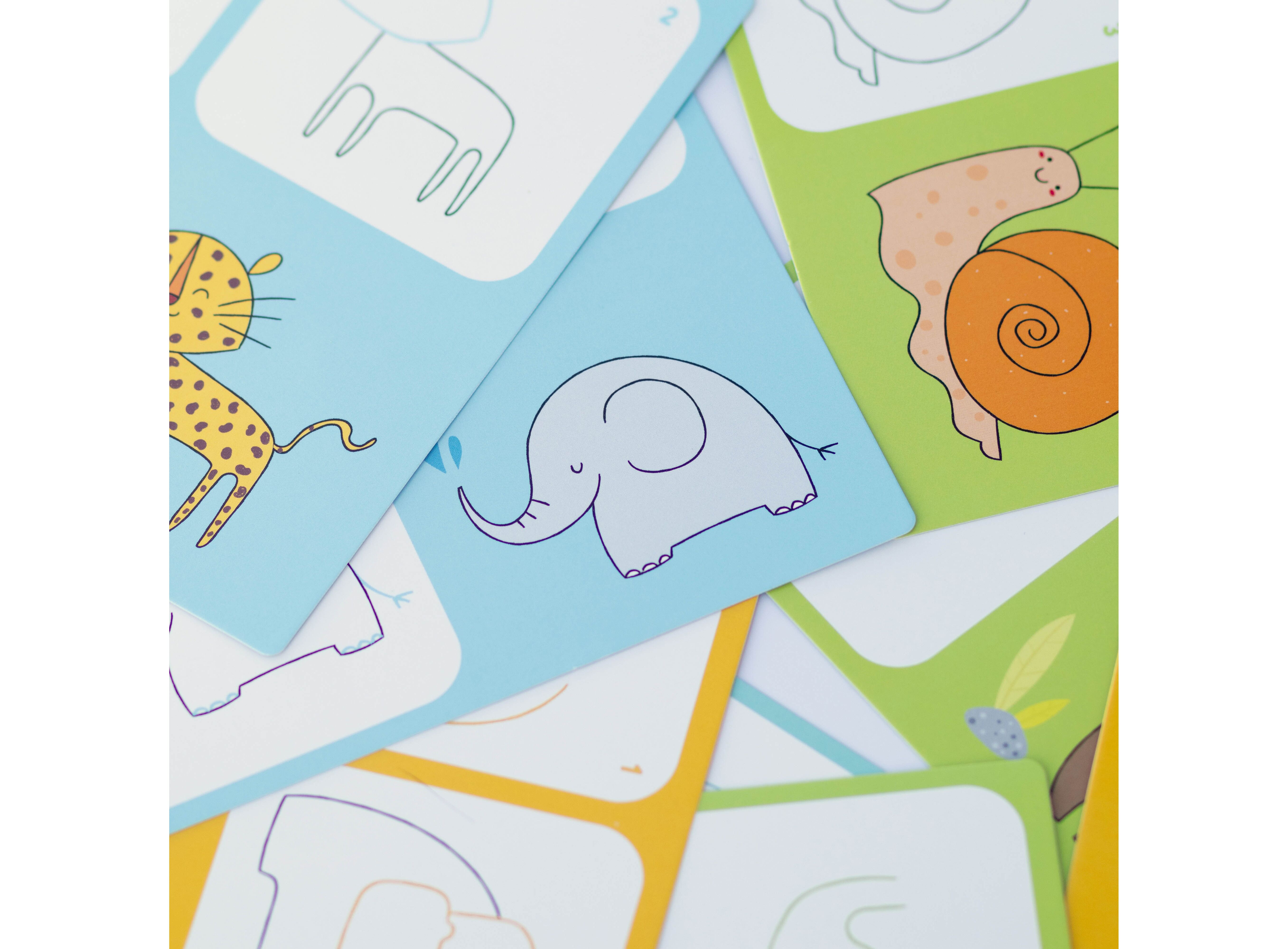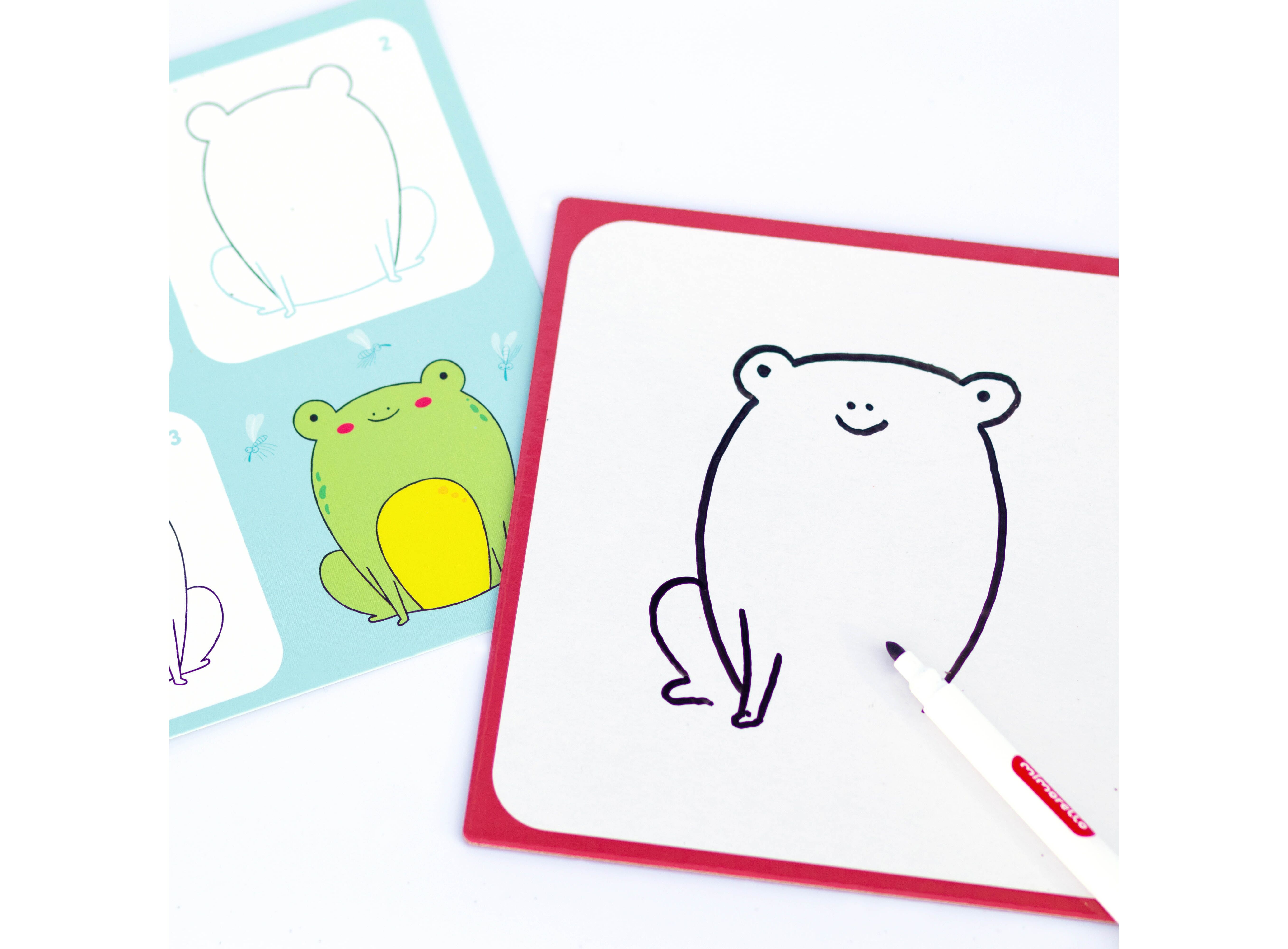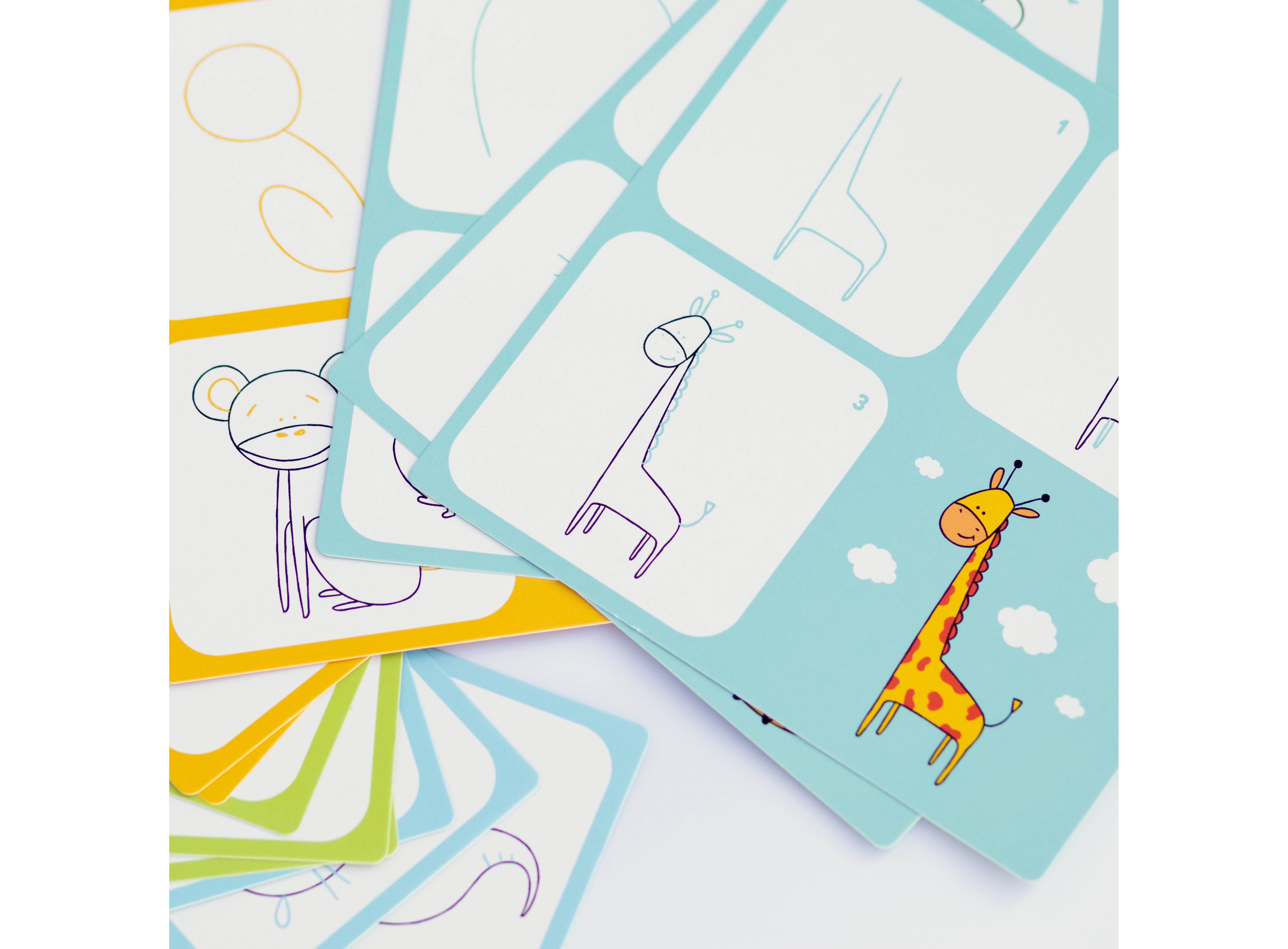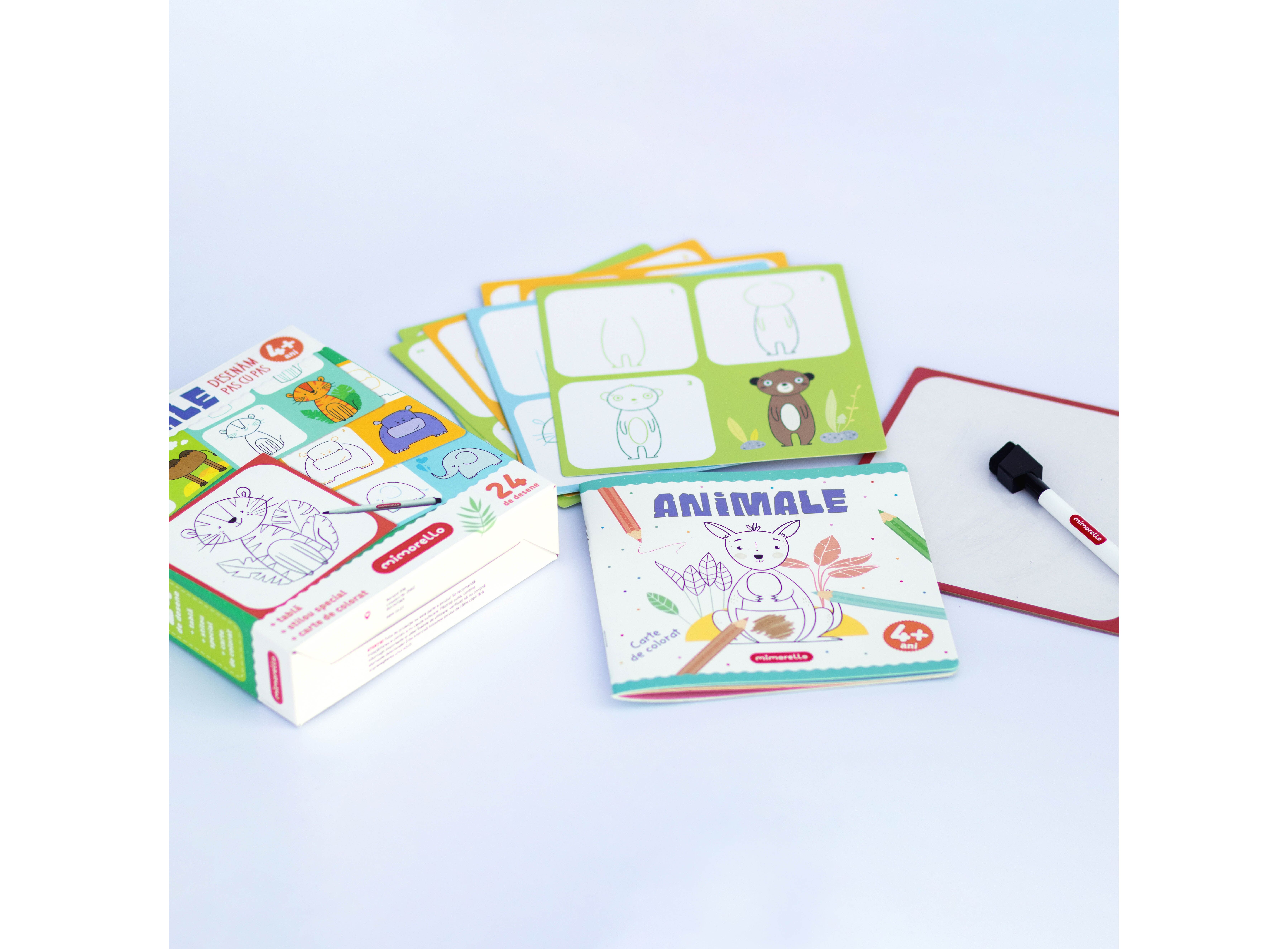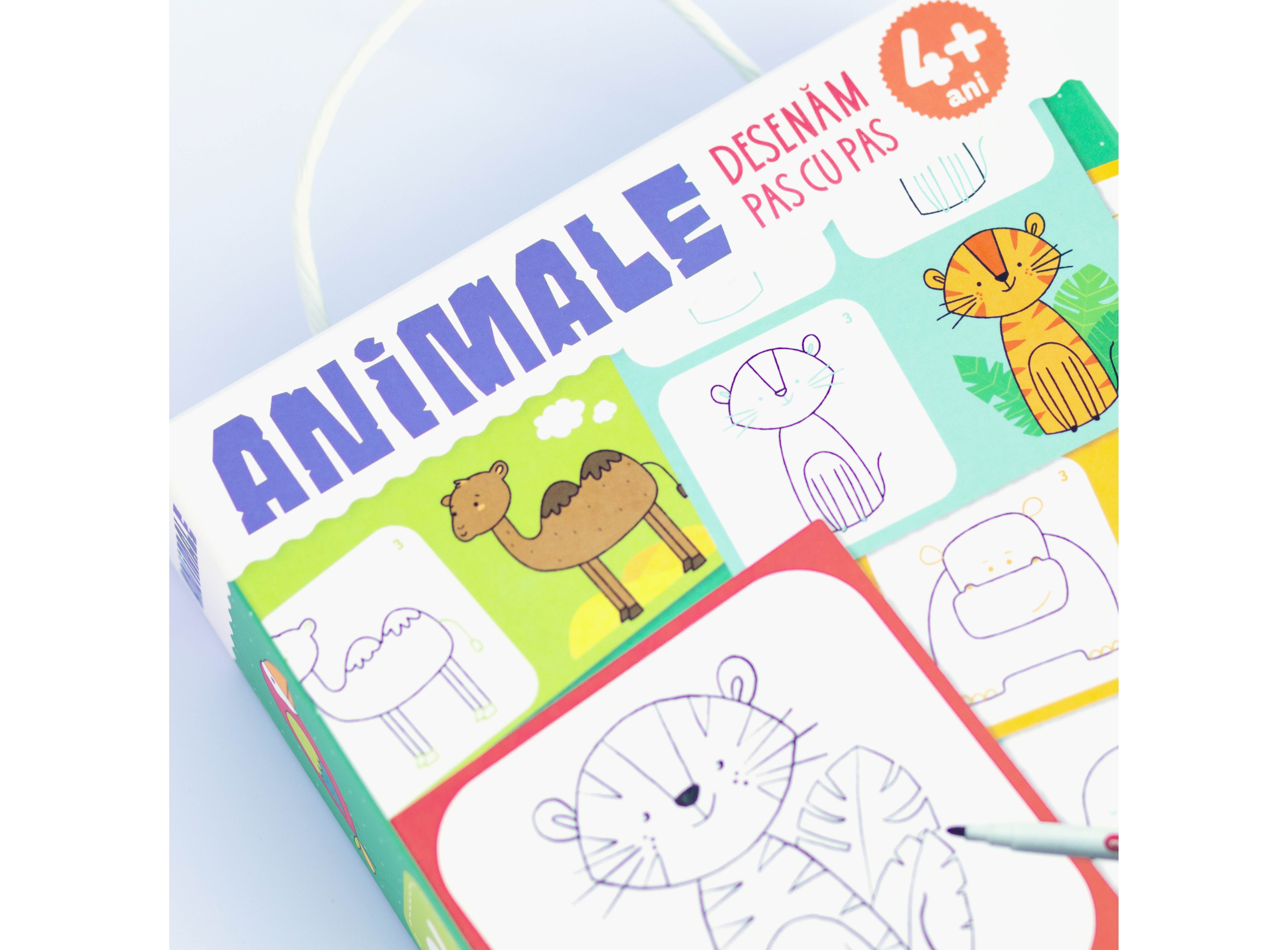 Fiecare cartonaș conține informații prin care copilul este îndrumat pas cu pas, având libertatea de a alege ordinea în care învață să deseneze animalele îndrăgite și posibilitatea de a șterge cu buretele eventualele greșeli, urmând ca, la final, să poata desena și colora modelele cu ușurințăși pe hârtie, în orice mărime dorită.