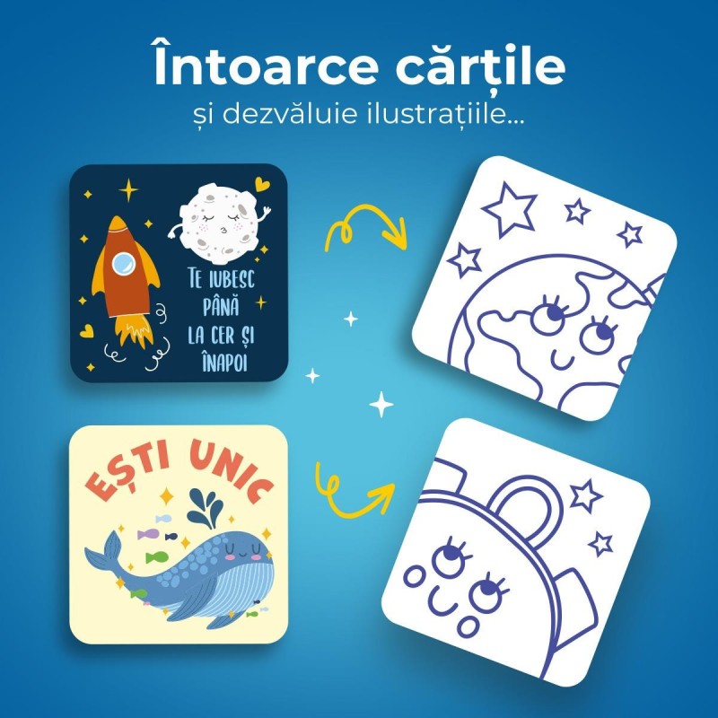 Cartonașele îi transmit emoție și încredere, apoi se transformă în puzzle-uri de colecție și ilustrații de colorat fabuloase.