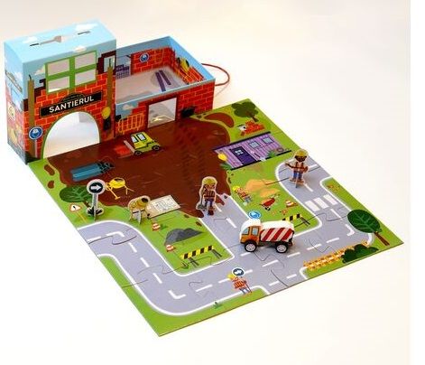 • Un puzzle format din 16 piese cartonate cu ajutorul carora poti recrea orasul din jurul santierului.