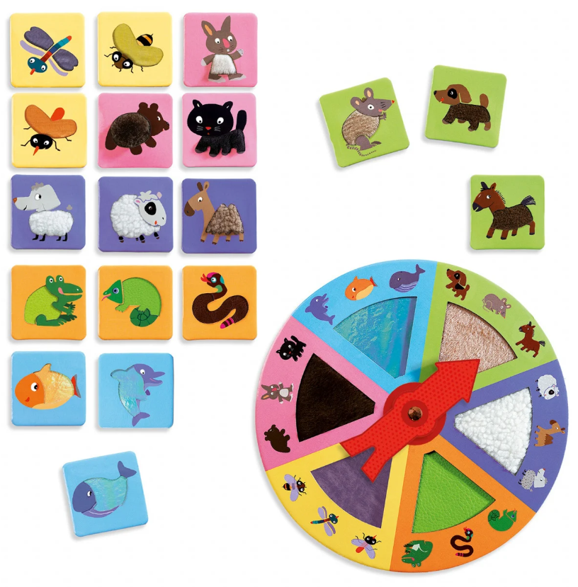 Conținut: 18 cartonașe animale cu corpuri texturate (dimensiune de 6 x 6 cm), ruletă care arată diferitele texturi, săculeț textil.