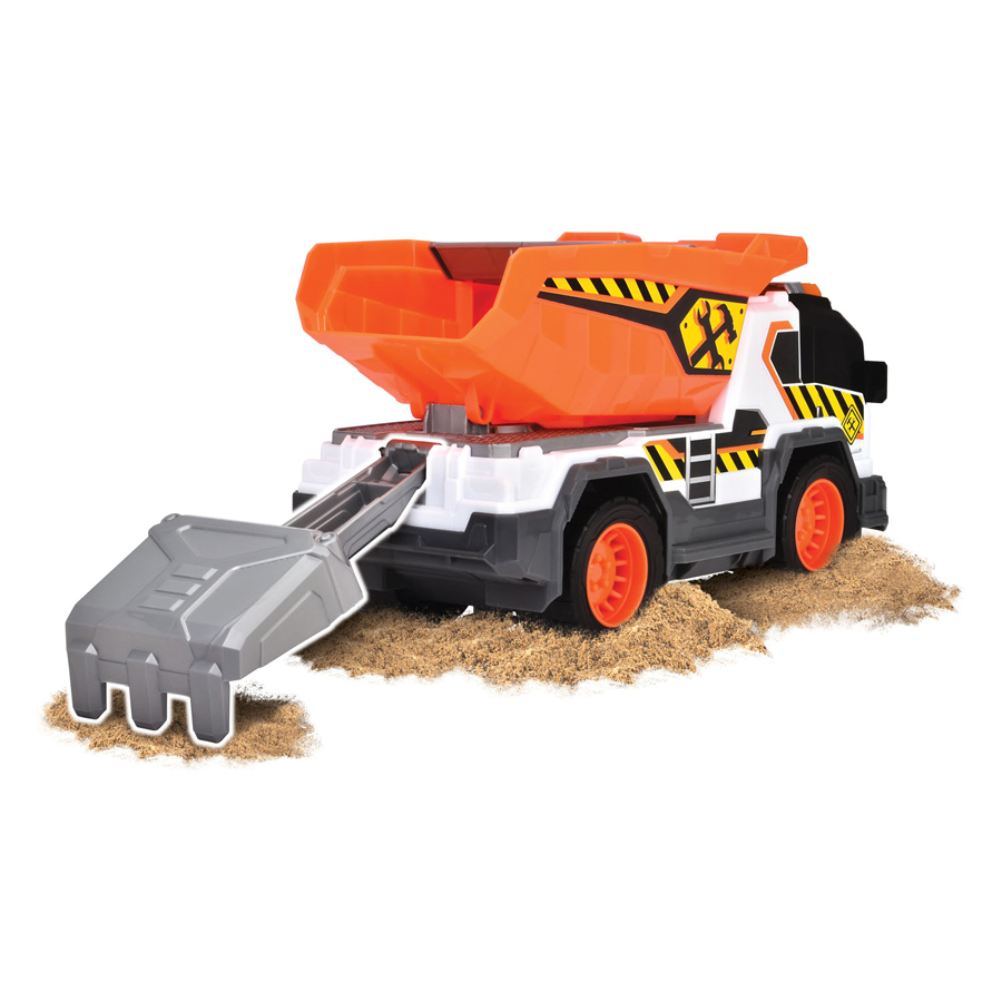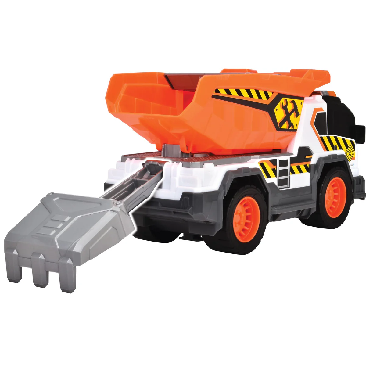 Dumperul este echipat cu o lumina de avertizare si pornire realista a motorului, bip invers si sunete de descarcare a resturilor.
