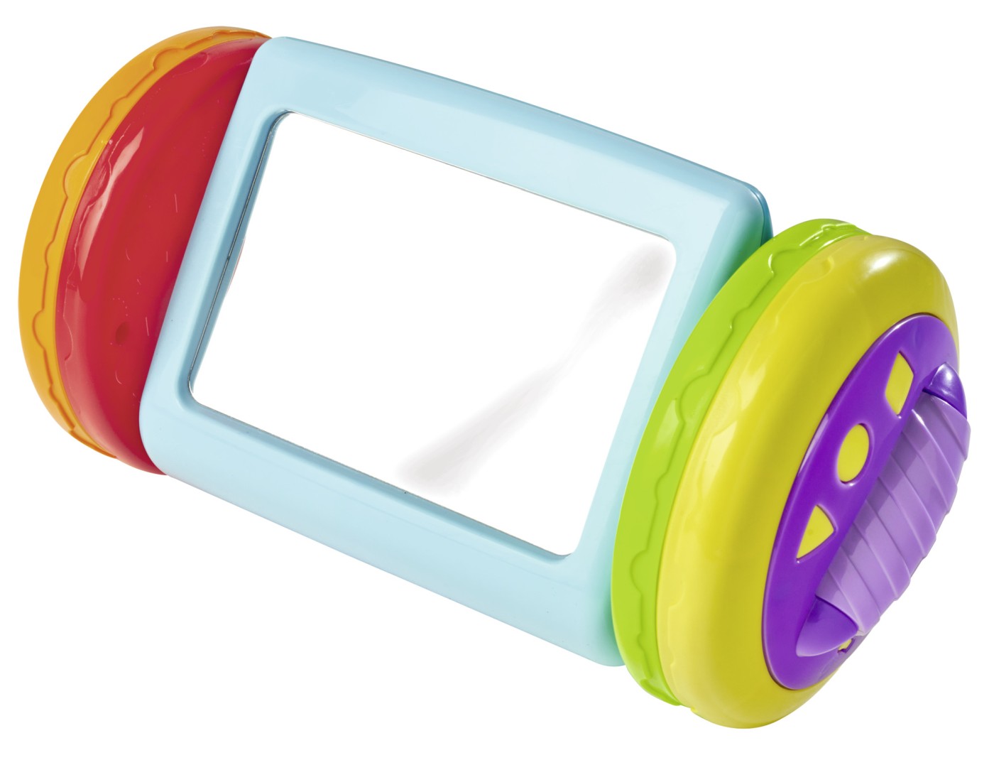 Aceasta jucarie va capta inca de la inceput atentia celor mici datorita design-ului dragut si culorilor vesele. Jucaria ajuta la dezvoltarea coordonarii ochi-mana, la identificarea culorilor si la perfectionarea miscarilor fine. Piesa centrala are o oglinda colorata pe o parte iar pe cealalta parte o imagine cu animale dragute, care pot fi rulate inainte si inapoi prin cele doua roti cu sunete