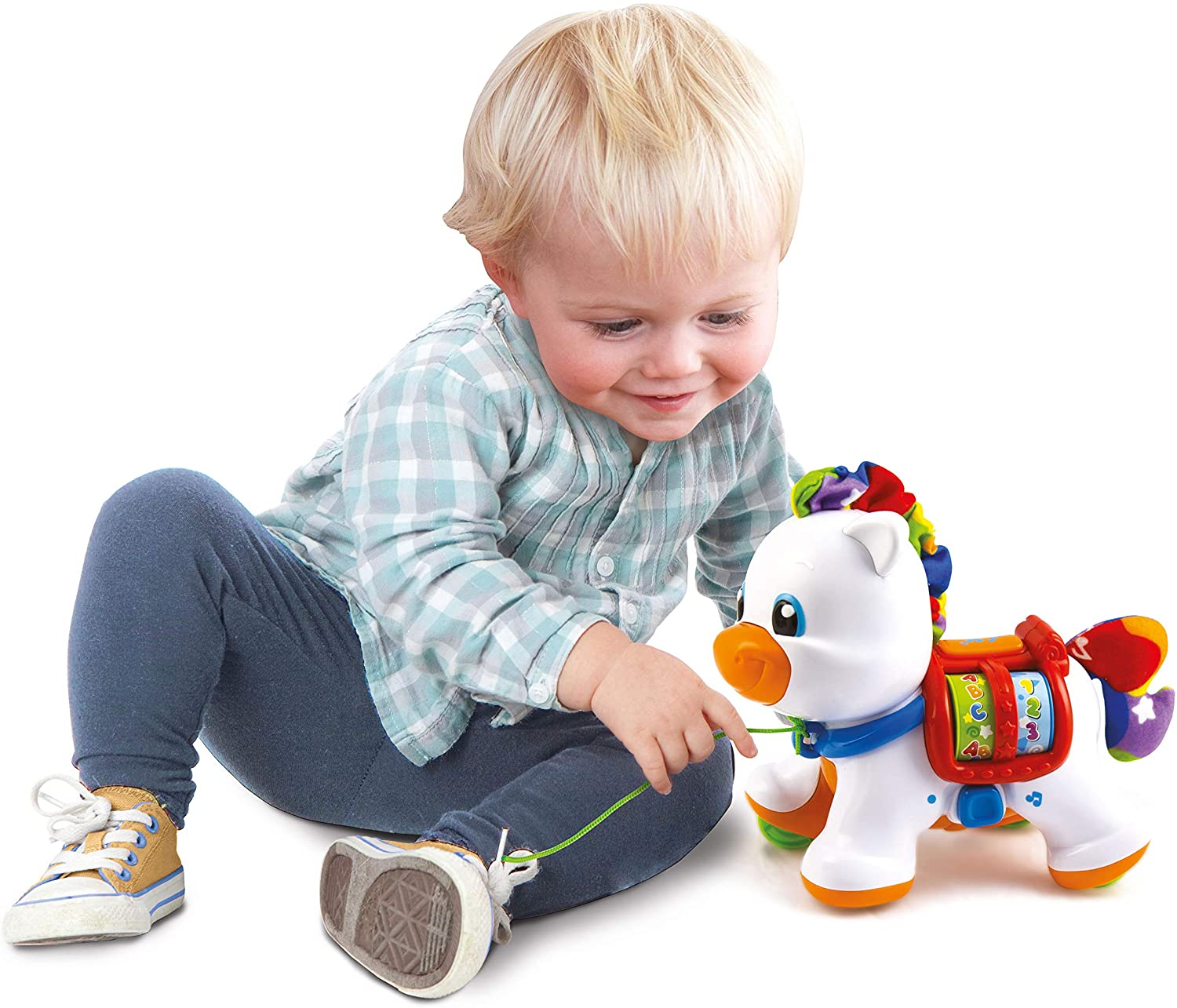 Apasarea butonului, jucatul cu rotile poneiului si sunetele amuzante il vor face pe micut sa rada. Atunci cand poneiul este tras de catre copil, acesta se va bucura sa asculte melodii interactive.