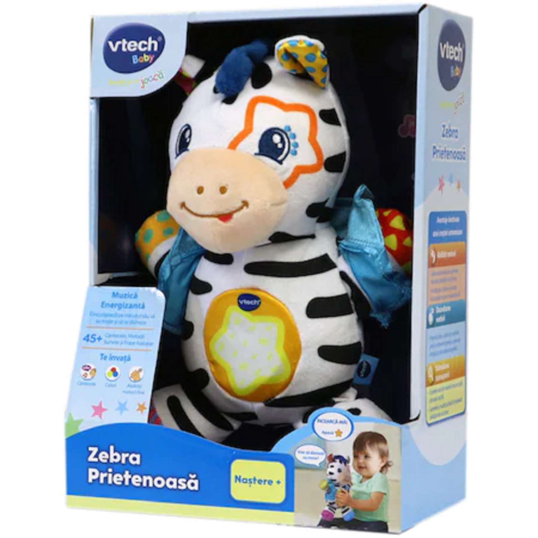 Aceasta zebra draguta este fabricata dintr-un material moale iar caracteristicile interactive si stilul sau aparte o fac sa fie cea mai interesanta jucarie din patut! Tesaturile matasoase ale zebrei vor ajuta la dezvoltarea atat simturilor tactile cat si a stimulilor vizuali ai micutului tau, iar suvitele si urechile zebrei, avand diferite culori ii stimuleaza dezvoltarea simturilor tactile. Apasand butonul de pe burtica zebrei, aceasta va reda muzica interesanta, melodii si fraze amuzante care sustin si incurajeaza dezvoltarea limbajului.