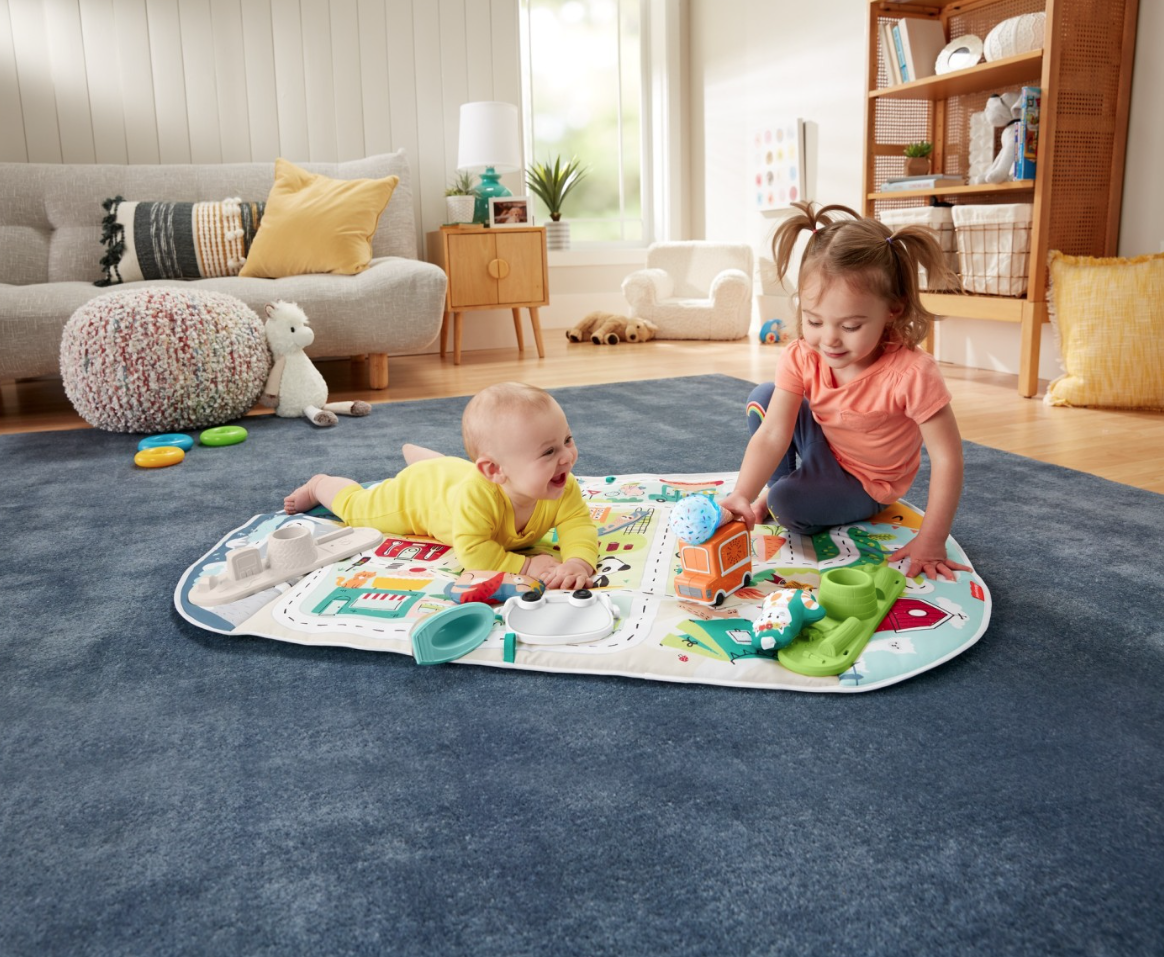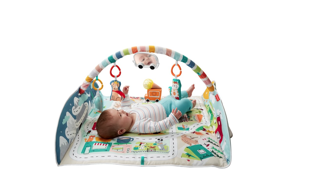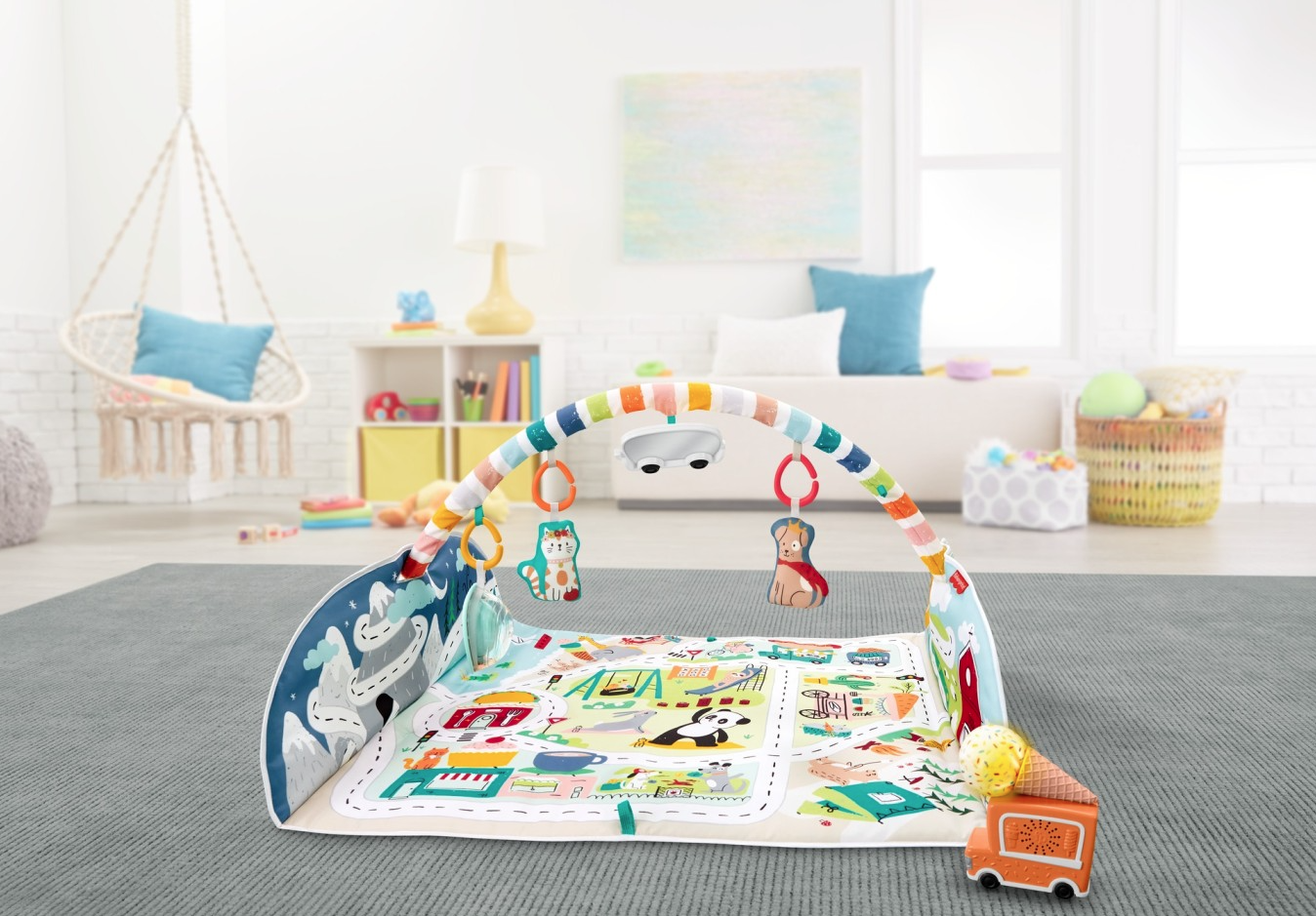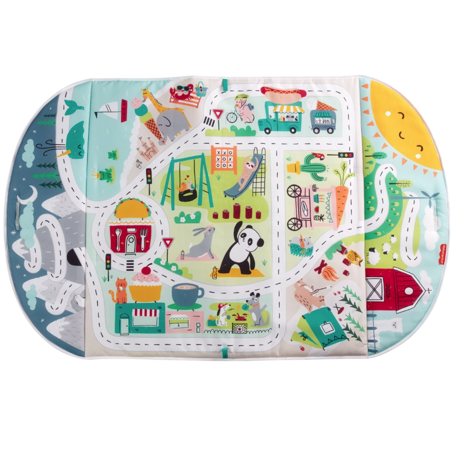 Pe covorasul cu activitati al bebelusului tau, cainii si pisicile sunt jucarii zornaitoare, iar vehiculele stralucitoare zboara pe cer. Un panda si un lenes sunt prieteni de antrenament ai bebelusului, iar un camion de inghetata reda pana la 25 de minute de muzica. Covorul cu activitati Distractie in oras de la Fisher-Price&reg ofera mai mult de 1,2 metri de spatiu de joaca pentru ca bebelusul dvs. sa exploreze pe masura ce creste! Vine cu 7 jucarii, inclusiv o oglinda de auto-descoperire si jucarii care se ataseaza la bara suspendata deasupra covorasului de joaca, plus un camion de inghetata care reda pana la 25 de minute de muzica. Pe masura ce copilul creste, covorul de joaca devine cadrul perfect pentru aventuri nesfarsite, copiii mici imping piesele de joc prin oras si peste cele mai inalte varfuri inzapezite. Explorarea minunatului oras ajuta la consolidarea abilitatilor motorii brute si fine ale bebelusului, precum si la implicarea simturilor lor vizuale, auditive si tactile!Covorasul de gimnastica pentru copii are o suprafata de joaca foarte mare, lavabila in masina de spalat, care devine un covor pentru vehicule atunci cand copiii crescSalteaua de joaca are o lungime de peste 1,2 metri si ofera mult spatiu pentru joc si relaxare, dar si pentru timpul petrecut pe burta de catre micutul tau!Camionul de inghetata activat prin miscare, reda pana la 25 de minute de muzica si lumineaza atunci cand bebelusul il impinge de-a lungul covorasului de joaca!Include 7 jucarii, inclusiv 3 vehicule, 2 animale si 2 piese pentru joc de rol