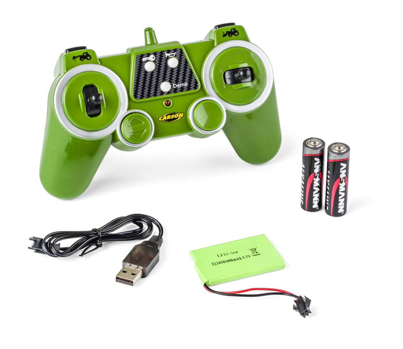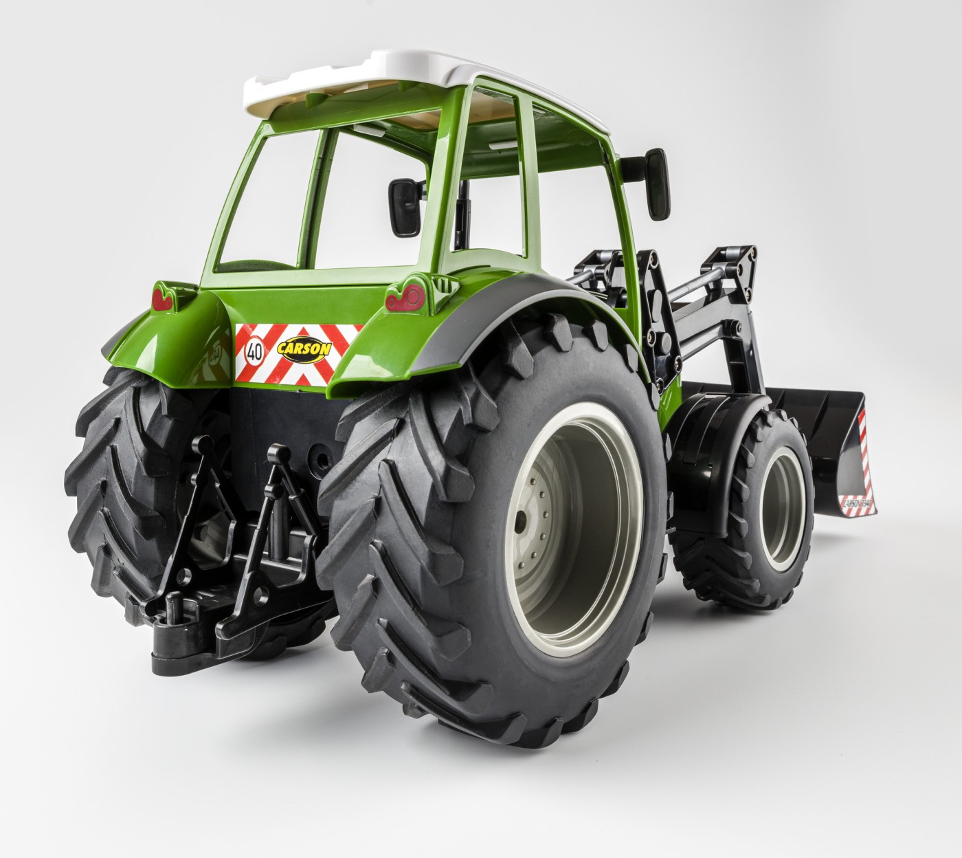 Tractor cu încărcător! Tractorul se deplasează pe teren accidentat și este echipat cu anvelope de cauciuc de aderență în profilul original. Vehiculul agricol la scara 1:16 include multe detalii cu cea mai recentă tehnologie, cum ar fi telecomanda multicanal de 2,4 GHz fără interferențe, sunet, lumină și sunetul motorului. Sistemul de telecomandă controlează funcții precum lumina, claxonul și sunetul motorului. Încărcătorul frontal poate ridica și coborî sarcini de până la 200 g. Transmițătorul poate fi folosit și pentru a ridica și a coborî găleata. Bateria de conducere Li-Ion încorporată permite un timp de condus de până la 50 de minute. Tractorul este complet echipat cu transmițător, baterii transmițătorului, acumulator, încărcător și instrucțiuni și este gata de pornire imediat după încărcare. Cumpărați – Încărcați – Conduceți!