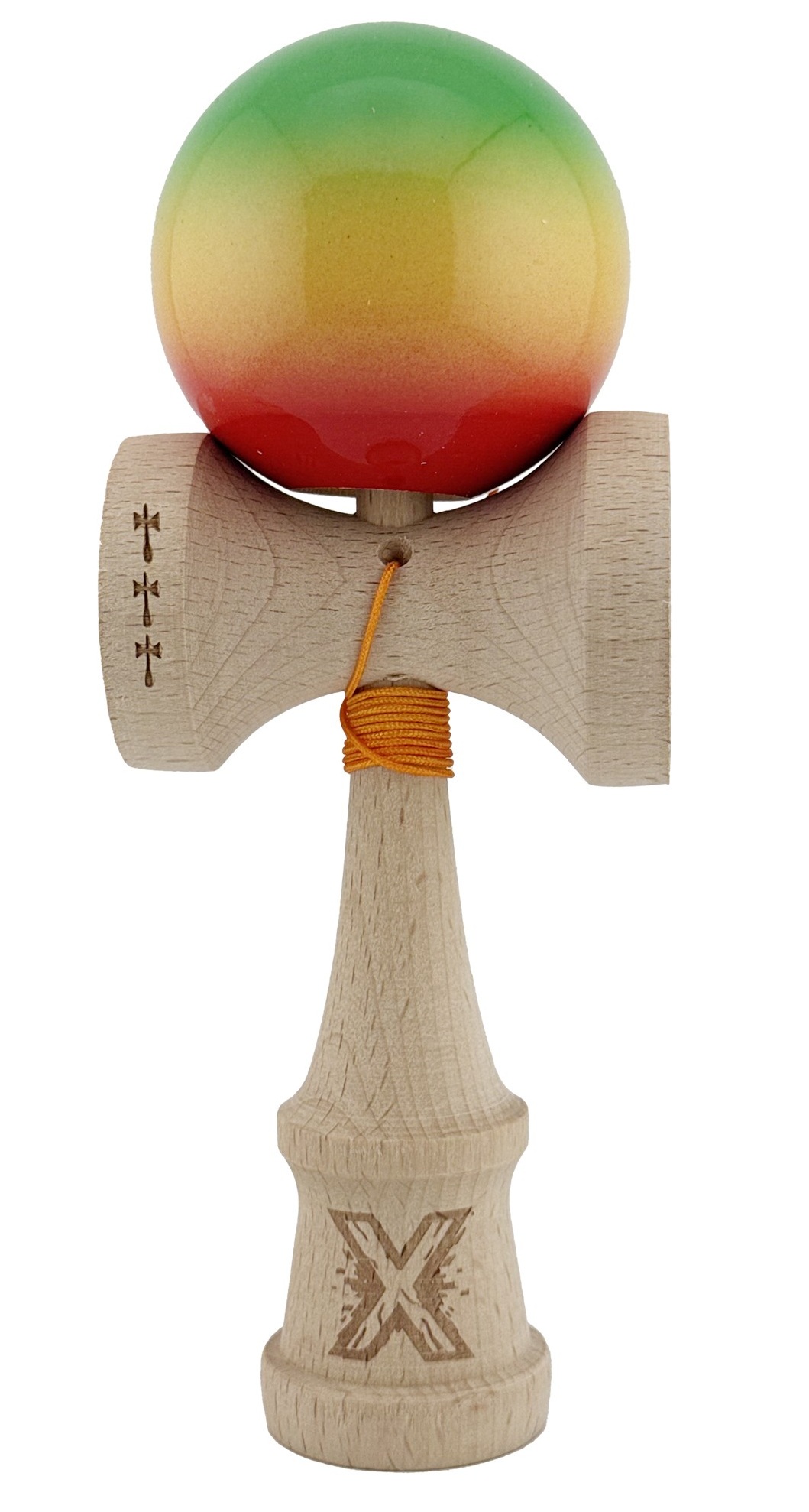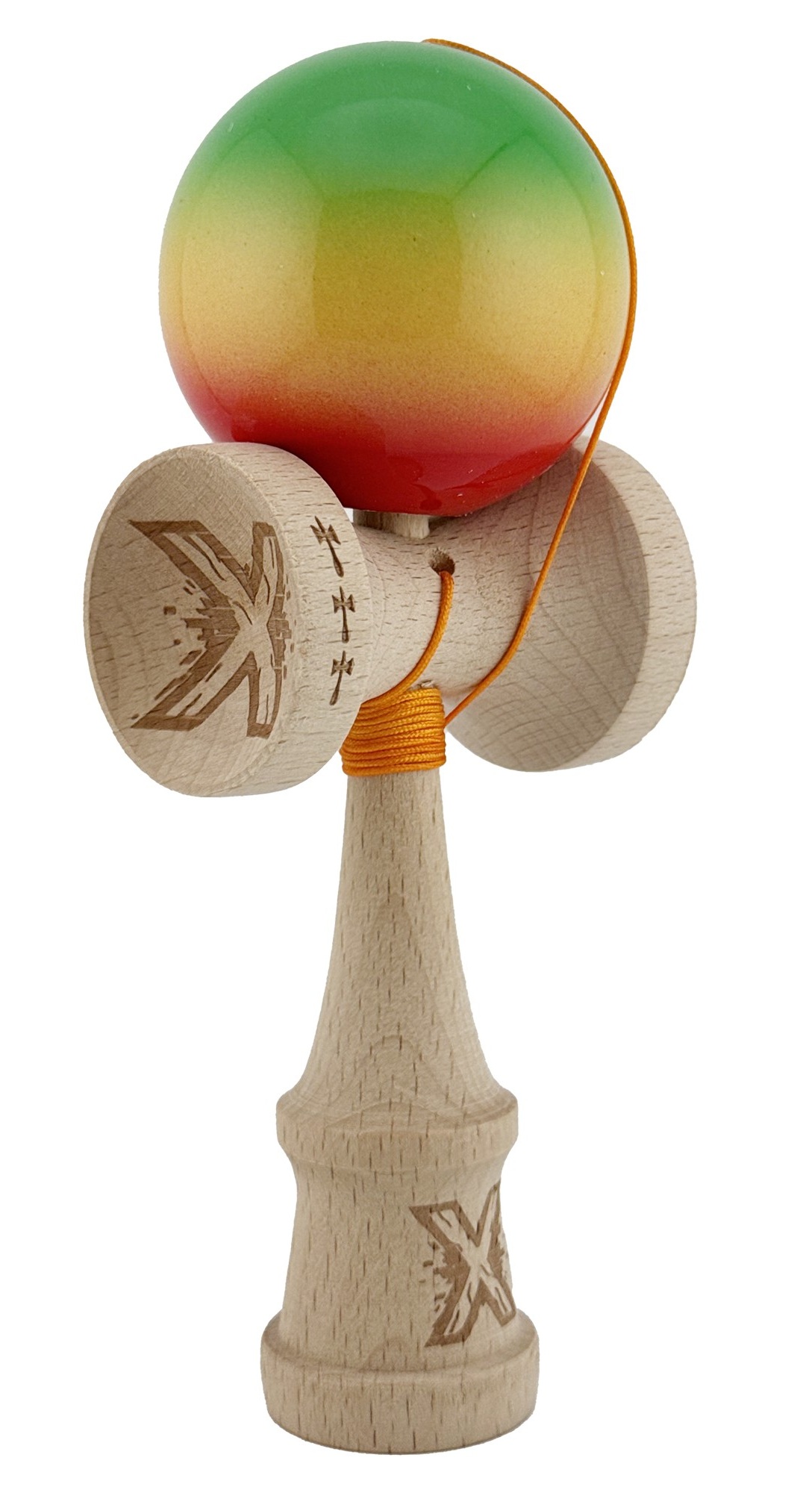 Kendama x, super sticky, cupe mari, rulment metalic, ață 55 cm, culoare verde/galben/rosu