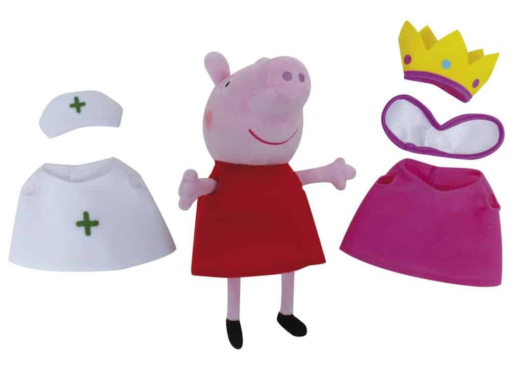Jucărie de pluș cu îndrăgitul personaj Peppa Pig completat de 3 ținute: asistentă, prințesă și cunoscuta rochie roșie. Astfel, copilul va putea crea noi povești dezvoltându-și imaginația.