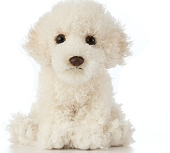 Jucarie de plus in forma de adorabil pui de labradoodle, alb si pufos, numai bun de imbratisat si smotocit.