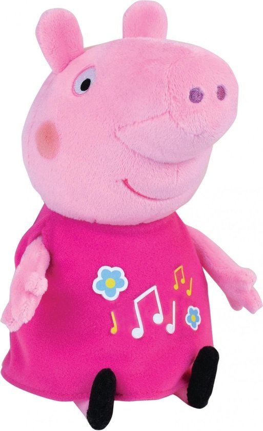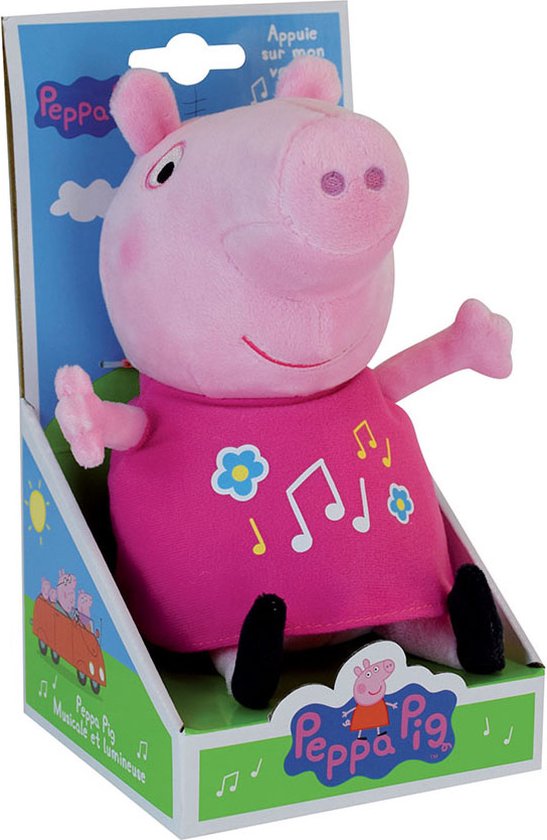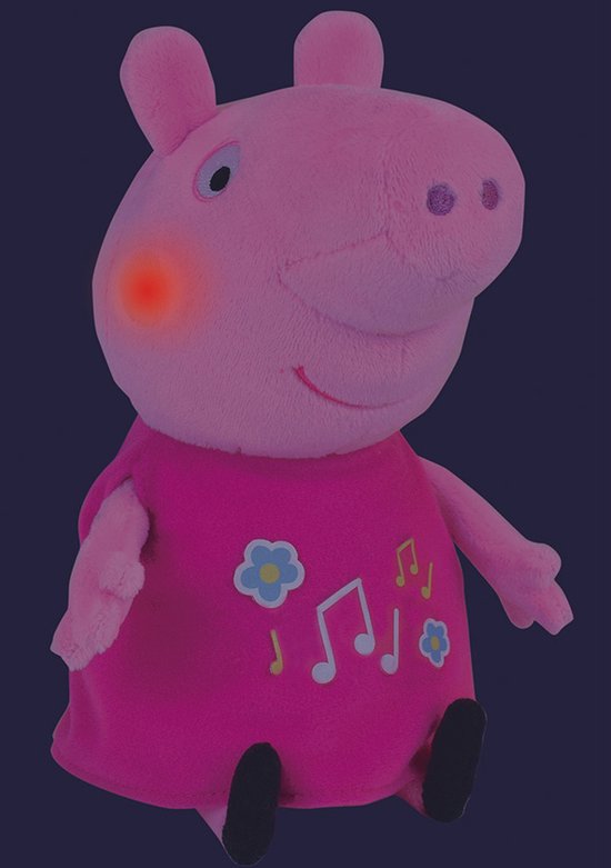 Jucărie de pluș cu îndrăgitul personaj Peppa Pig care emite muzică și i se aprind obrajii prin apăsarea unui buton.