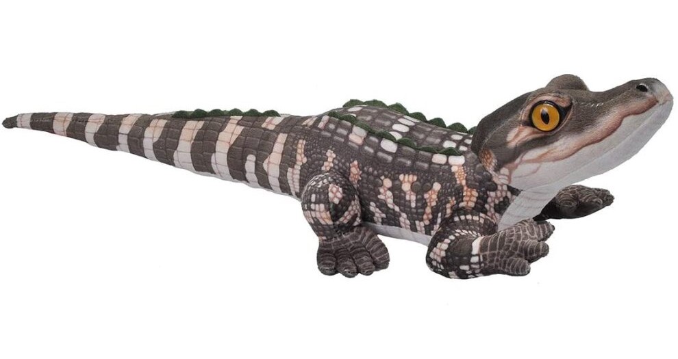 Pui de aligator din pluș, moale și drăgălaș cu detalii realiste, realizat din materiale reciclate.