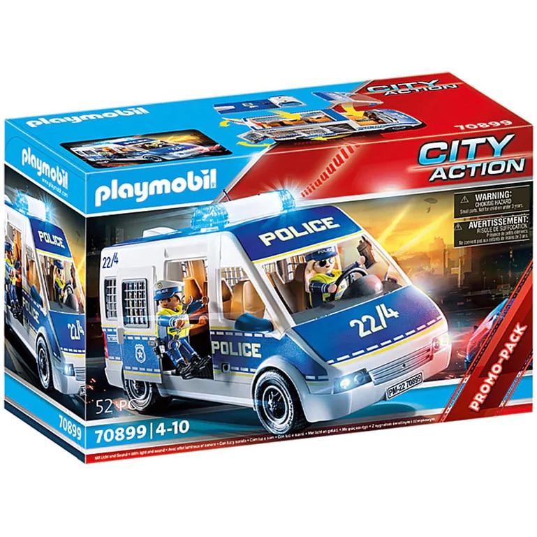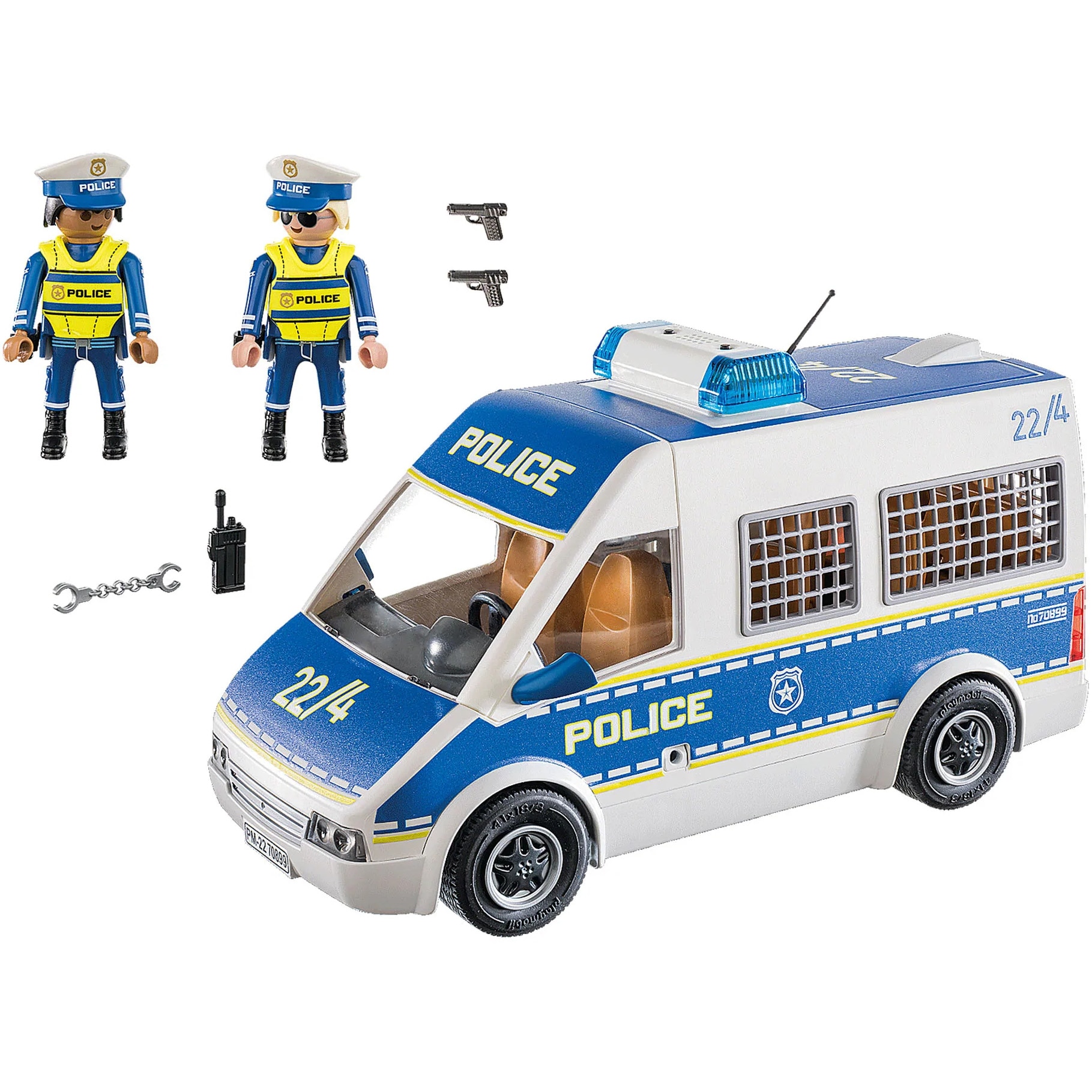 Atentie operatiune de politie! Fie ca este vorba despre o vanatoare de oameni, o operatiune de cautare sau asigurarea unui accident - datorita dubei de politie cu lumina si sunet, politia PLAYMOBIL este bine echipata pentru orice misiune. Masina spatioasa are loc pentru sapte figurine, iar echipamentul poate fi depozitat in spatiul de depozitare de sub bancheta din spate. Pe langa autobuzul lor de politie, oamenii legii au la ei veste, catuse, radio si alte echipamente. Acoperisurile cabinei soferului pot fi indepartate, iar usa glisanta laterala se deschide spre exterior. Un buton de pe sub caroseria vehiculului poate fi folosit pentru a comuta intre doua sunete de sirena.