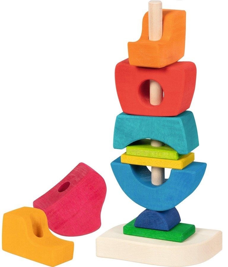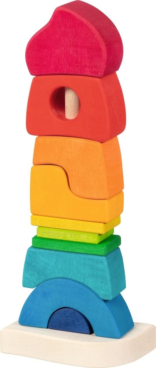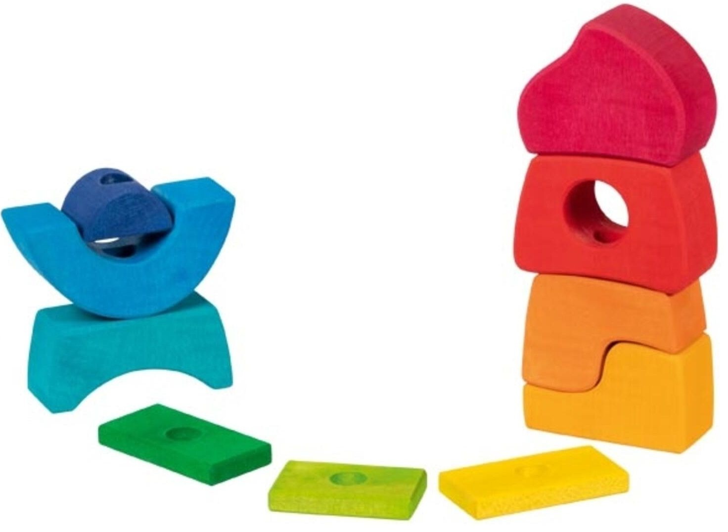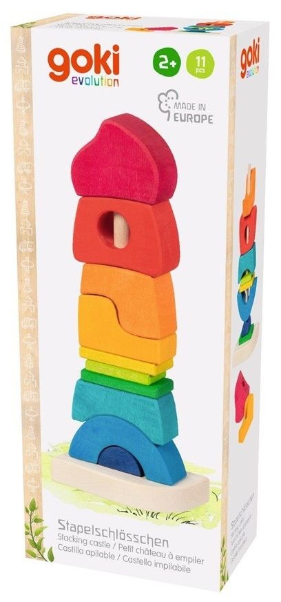Jucăria educativă Castel de stivuit, din colecția Goki Evolution, este format din 11 piese din lemn din care copilul poate face un castel colorat și alte construcții specifice activității de joc liber.