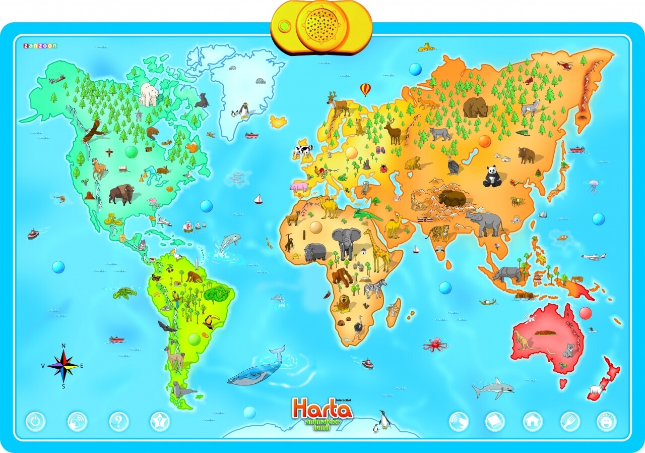 O jucarie educativa pentru intraga familie! O voce prietenoasa indruma copilul pe parcursul fiecarei activitati, explicand sectiunile hartii si adresand intrebari cu privire la acestea. Activitatile din cadrul testelor permit copilului sa isi verifice cunostintele. Jocul il felicita pe copil pentru fiecare raspuns corect. Daca raspunsul este gresit, jucaria va da raspunsul corect.