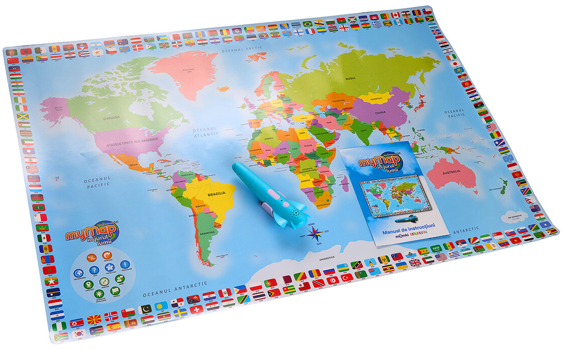 Foloseste stiloul interactiv vorbitor pentru a atinge tari, oceane si drapele pentru a obtine informatii.