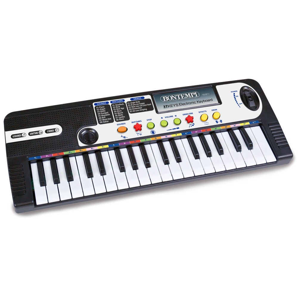 Orga electronica cu 37 de clape. Descopera talentul muzical al copilului tau! Orga poate fi folosita ca prim instrument. Muzica calmeaza si invata sunetele si ritmul. Tastatura include 5 piese demo, 8 sunete si ritmuri, precum si un mod de inregistrare si redare. Puteti inregistra si reda melodii. Programare ritmica. Comenzi: Volum general, Stop, Tempo +/–. Efecte: Sustain, Vibrato, Echo. Alimentare: 4 baterii R 6 / AA 1,5 V (nu sunt incluse). Beneficiile acestui instrument sunt: familiarizarea cu muzica si ritmul, dezvoltarea abilitatilor sociale si cognitive, coordonarea miscarilor, atentia distributiva.