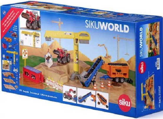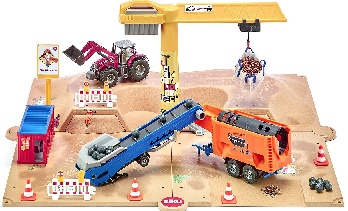 Copiii au o mare fascinație pentru gropile de excavare. Pământ, pietriș, nisip și noroi, mașini mari și încărcături. Cu noul set SIKUWORLD, camera de joacă devine un șantier important. Setul este format din patru panouri noi de pământ, a căror temă de culoare și formă creează o groapă de excavare, dar sunt și compatibile cu celelalte panouri din SIKUWORLD. Cabana de șantier a fost ridicată, barierele instalate, iar macaraua mare de șantier este la loc. Lucrările de construcție pot începe: brațul pivotează, iar căruciorul mobil poate fi folosit pentru a ridica materialele de construcție pe cârlig și pentru a le așeza pe banda transportoare și unitatea de sortare. Banda transportoare poate fi mutată folosind un buton rotativ. Aceasta transportă materialul rezidual către unitatea de sortare. Aceasta sortează materialele pentru îndepărtare pentru reutilizare la fața locului. Tractorul versatil inclus in set are cuplaj de remorca pentru manevrarea utilajelor de pe santier. timp de construcție: 10 minute. Dimensiuni : 540x540x235 mm