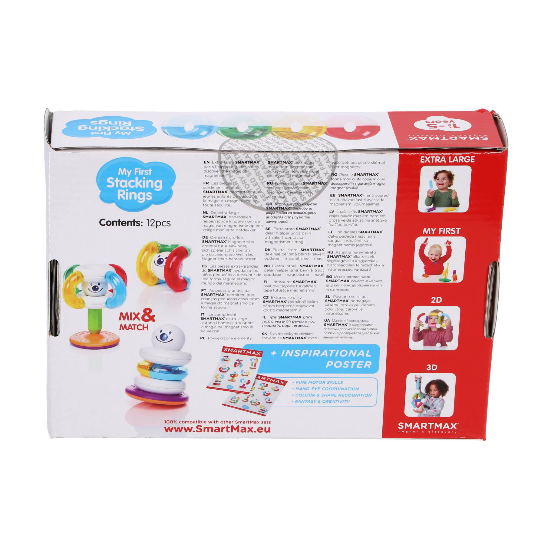 Experimentați stivuirea și balansul cu My First Stacking Rings. Această nouă interpretare a jucăriei clasice stârnește creativitate fără margini. Priviți cum inelele magnetice se împart în jumătate și se conectează în moduri ciudate, dând viață figurilor amuzante. Pentru copii de la 18 luni la 5 ani, acest set promovează coordonarea ochi-mână, echilibrul și abilitățile motorii fine. My First Stacking Rings se integrează perfect cu alte seturi SmartMax, extinzând universul magnetic al copilului tău și îmbunătățindu-i timpul de joacă.