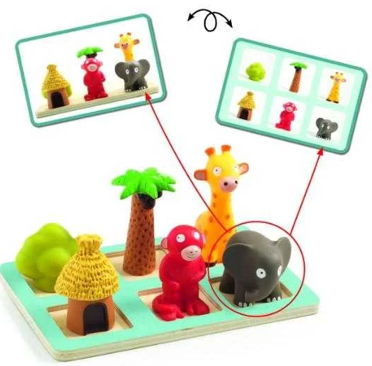 Un joc distractiv și simplu din colecția Eduludo pentru a-i învăța pe copii despre relațiile spațiale. Ei trebuie să așeze corect figurile pe tablă pentru a reproduce imaginea. Unde este girafa? Este în fața elefantului sau în spatele lui? La stânga sau la dreapta? Soluțiile sunt furnizate pe spatele cardurilor.