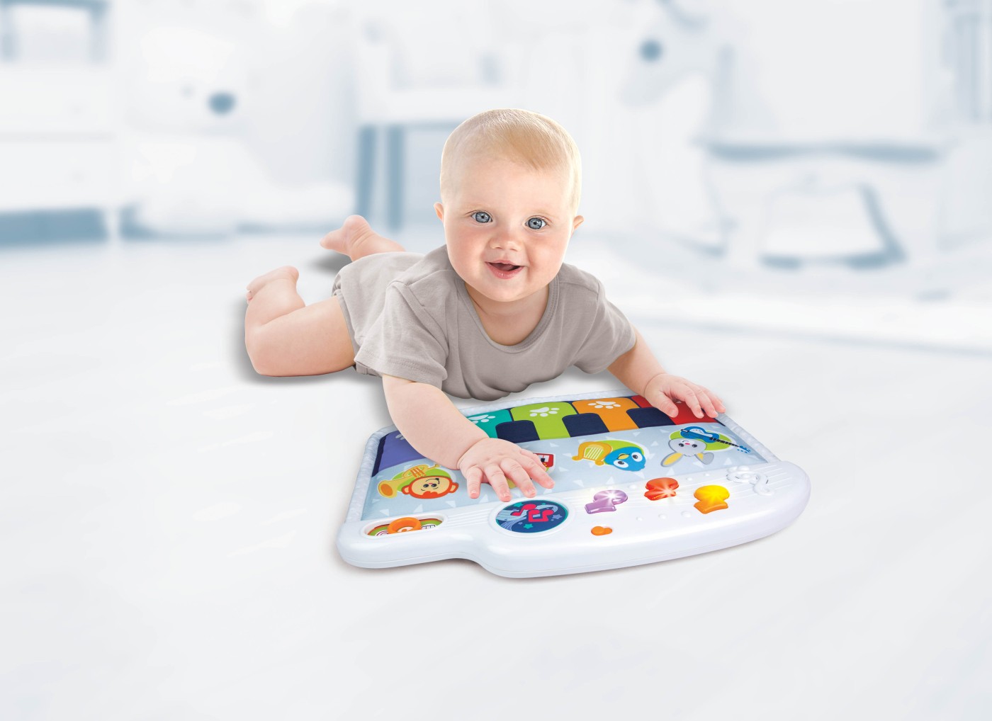 Lumini intermitente acompaniaza sunetele produse de pian, adaugand o dimensiune vizuala jocului si atragand atentia copilului in mod captivant. De asemenea, pianul serveste si ca un instrument educativ util in dezvoltarea abilitatilor motorii fine ale bebelusului. Prin manipularea butoanelor si a tastelor, micutul isi dezvolta coordonarea mana-ochi si invata despre cauzalitate, intelegand ca actiunile sale au efecte in mediul inconjurator.