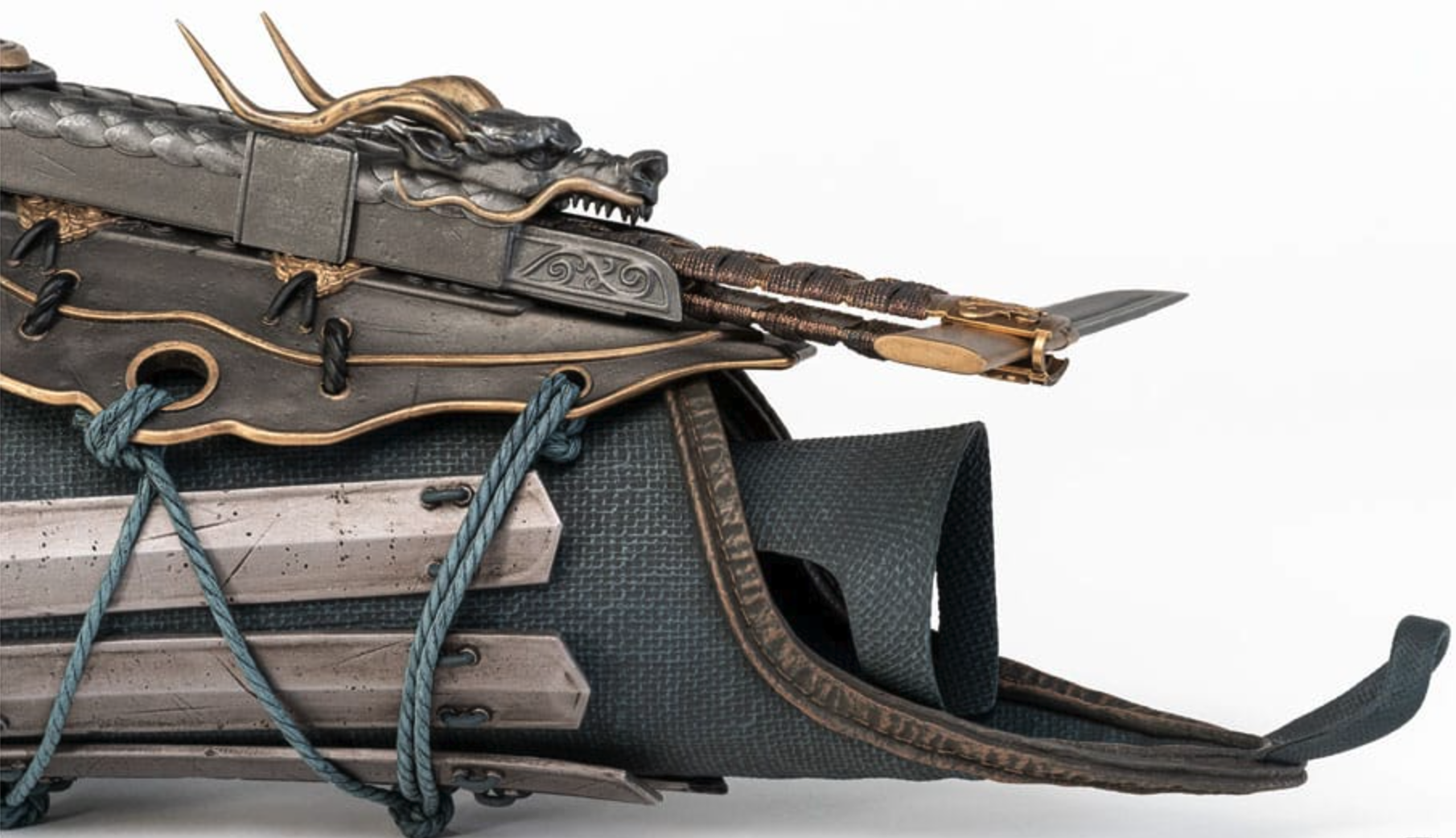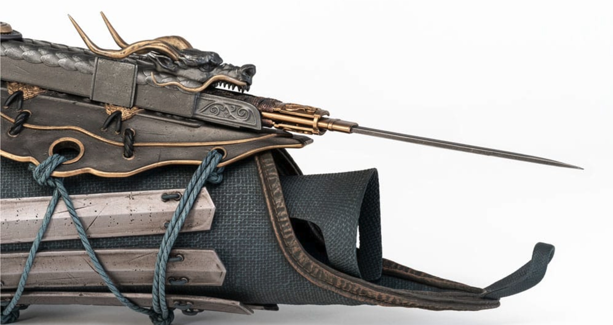 • Funcționalitate reală: mecanism pivotant activ – modul “Hidden Blade” se extinde și retrage printr-un sistem de buton, iar lama pivotantă imită stilul “Tanto grip” al lui Naoe .
