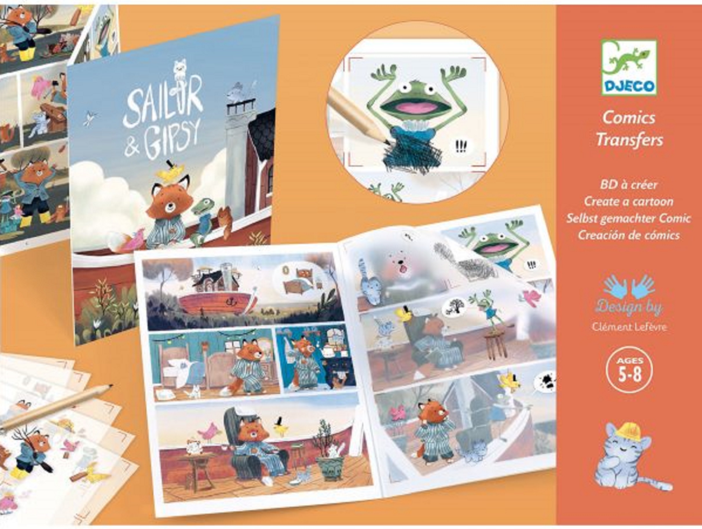 Acest set îi invită pe copii să creeze o bandă desenată cu personaje amuzante folosind planșele de transfer: imaginile se răzuiesc ușor cu creionul și se transferă pe planșa fundal preilustrată. Pas cu pas, copiii poziționează elementele pe fundal pentru a completa povestea pe măsură ce povestea prinde contur în fața lor.