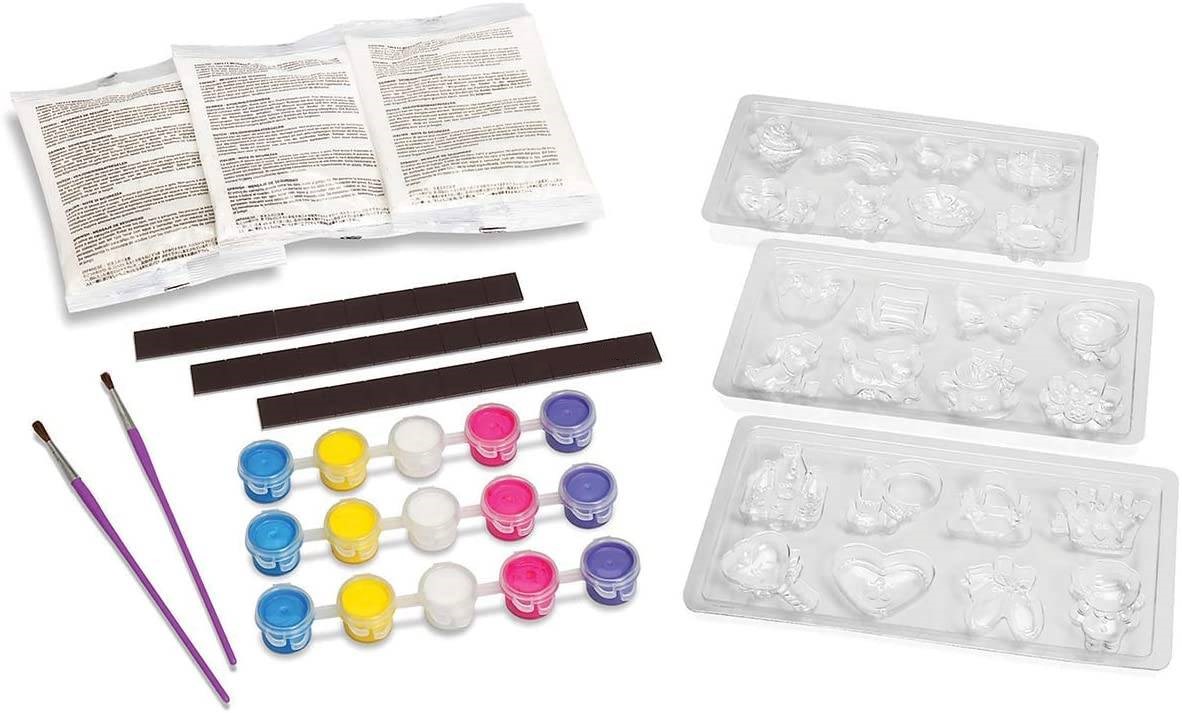 Kit pentru a realiza peste 30 de piese de magneți pentru frigider de aproximativ 4cm x 3cm. Conține 3 forme cu 24 de modele, 3 pungi de pudră de ipsos, magneți, 3 benzi cu recipiente cu vopsea, 2 pensule, instrucțiuni detaliate.