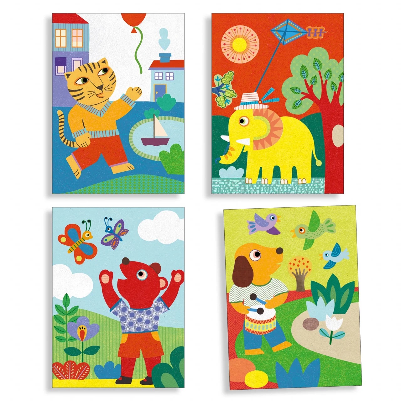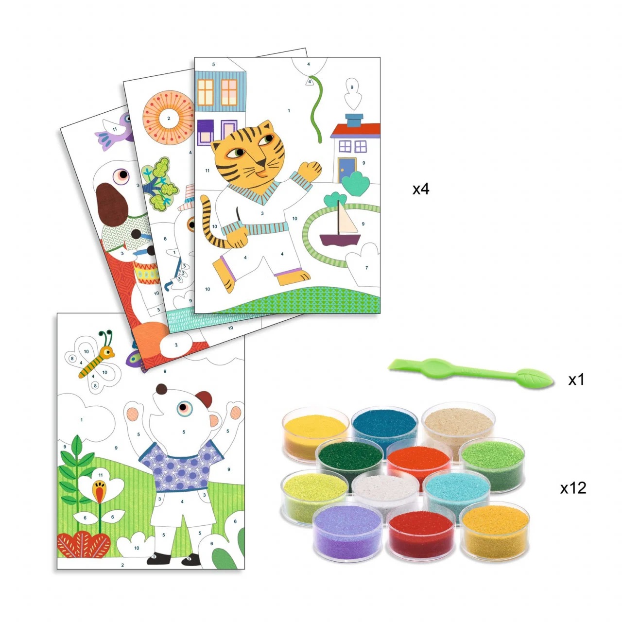 Conținut: 4 cartonașe parțial ilustrate și pre-lipite (15 x 21 cm), 12 recipiente cu nisip colorat, 1 instrument din plastic, broșură color de instrucțiuni pas cu pas.