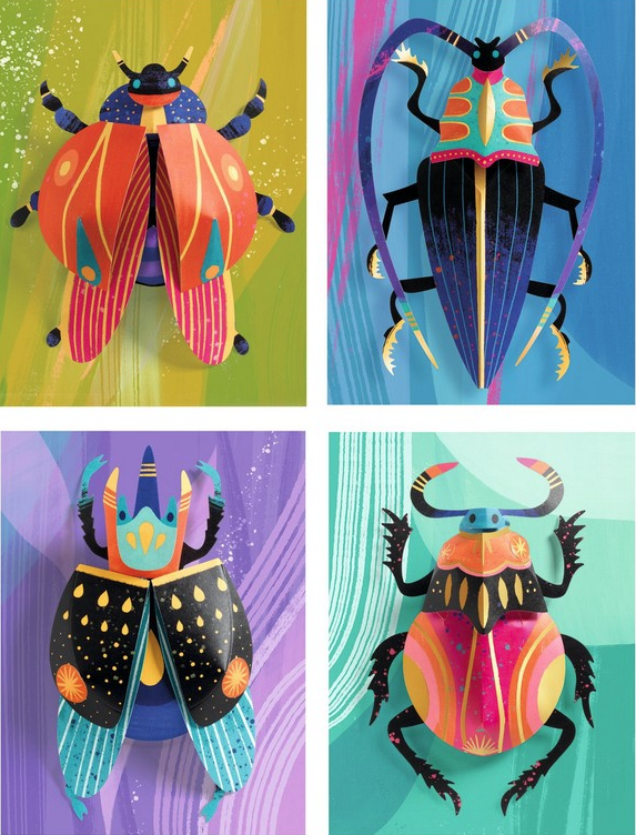 Faceți și decorați patru insecte de hârtie 3-D gata pentru a adăuga un pic de stil manual unei camere. Toate piesele sunt pre-tăiate și pre-pliate pentru o construcție simplă, trebuie doar să adăugați culoare și să le asamblați.